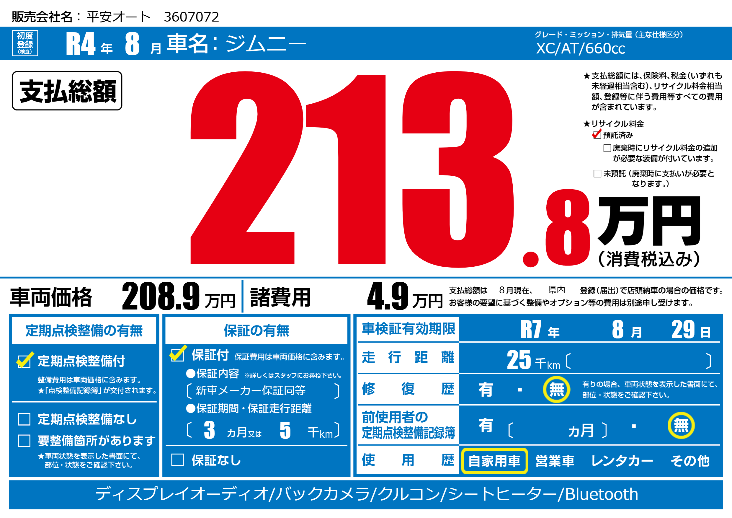 | 走行キロ | 2.5万km | 初年度登録 | R4年8月 |