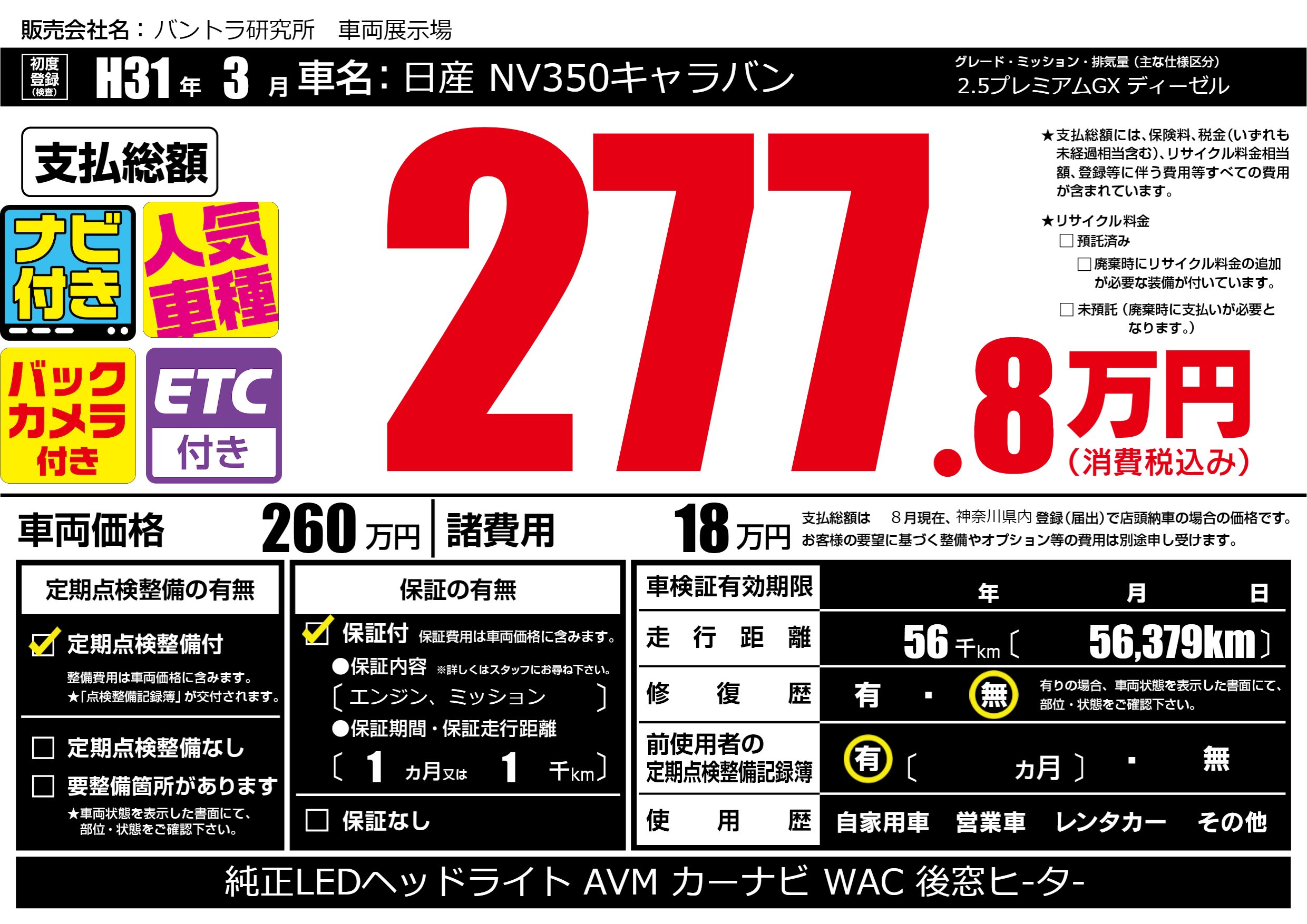 | 車名 | 日産 NV350キャラバン | グレード ミッション 排気量 |