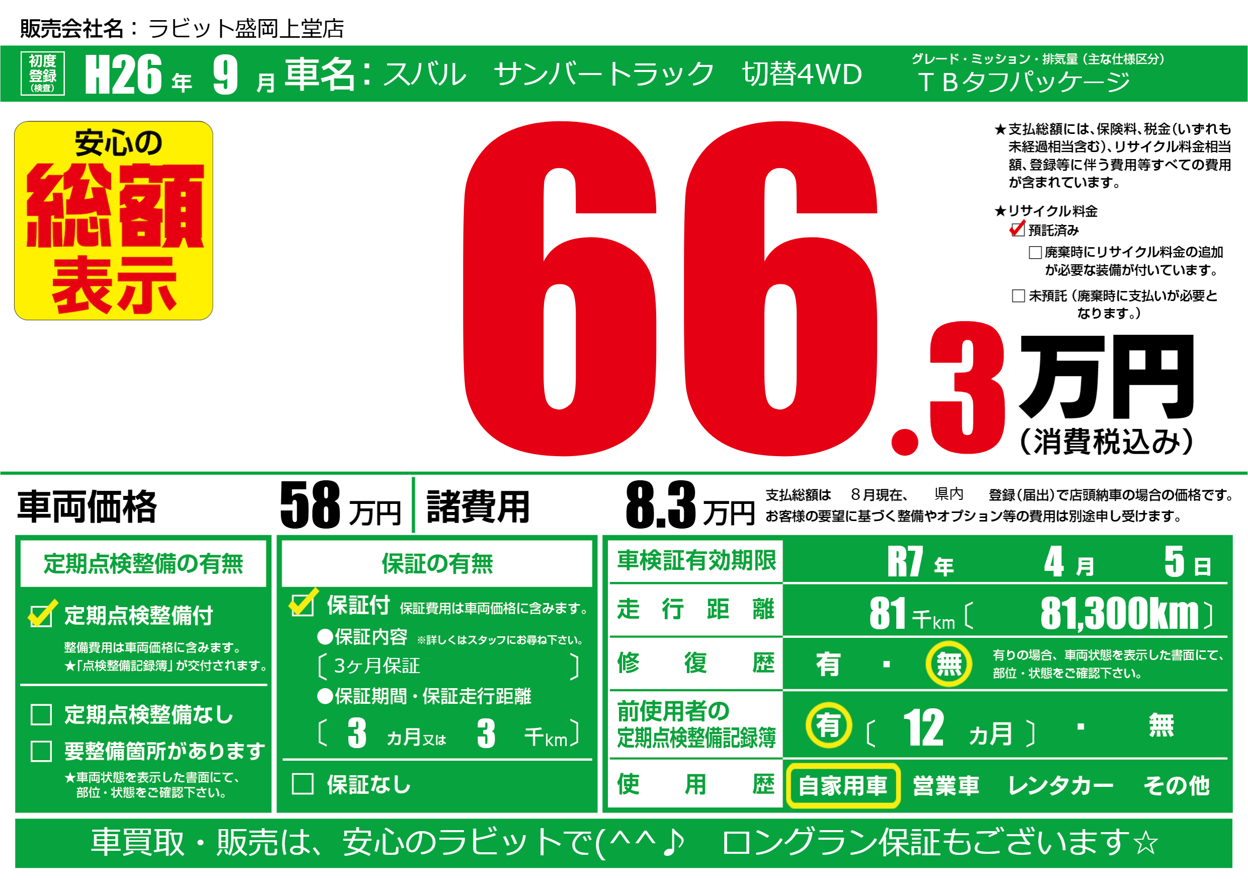 | 車名 | スバル サンバートラック 切替4WD | グレード ミッション 排気量 |