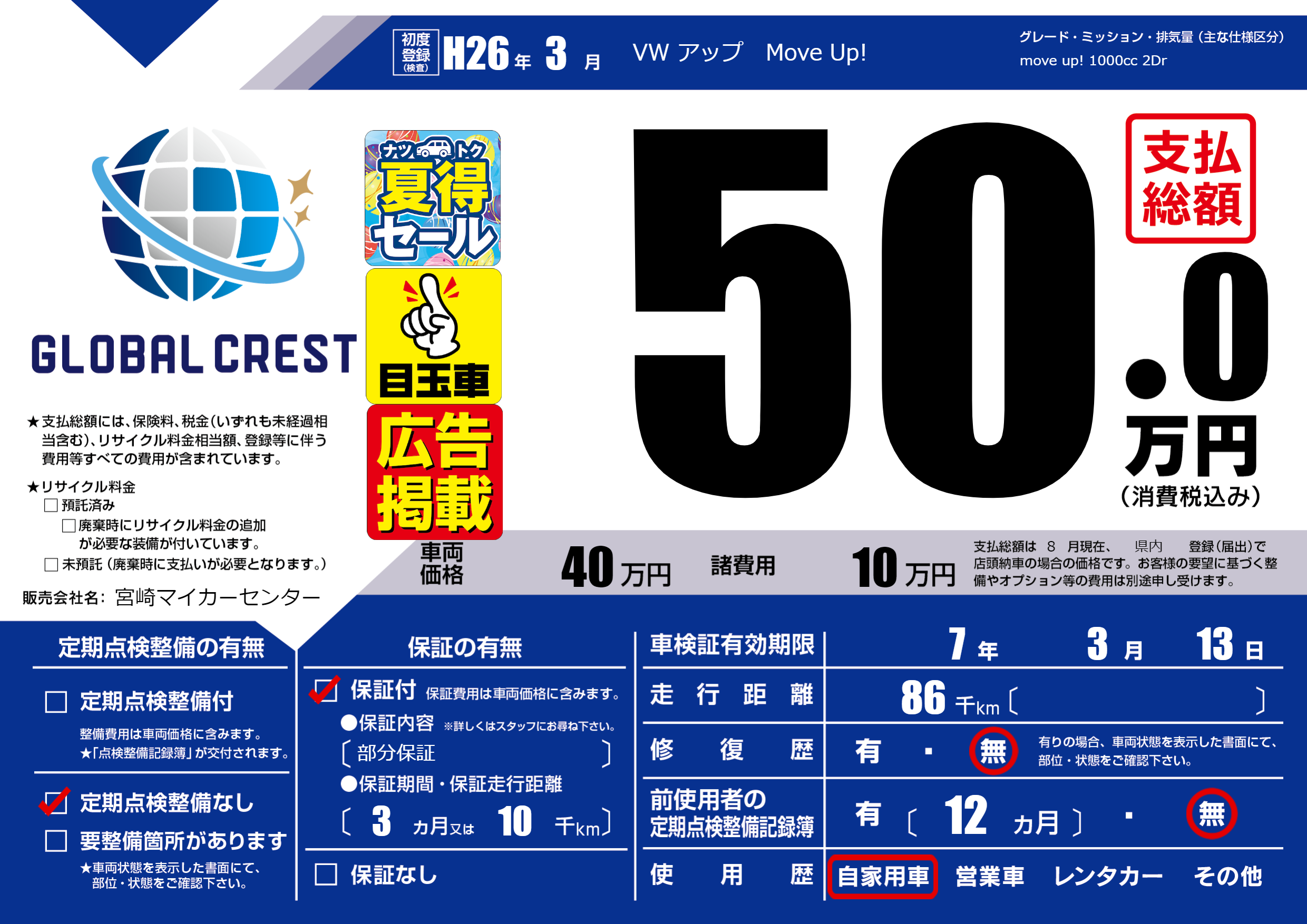 | 車名 | VW アップ Move Up! | グレード ミッション 排気量 |