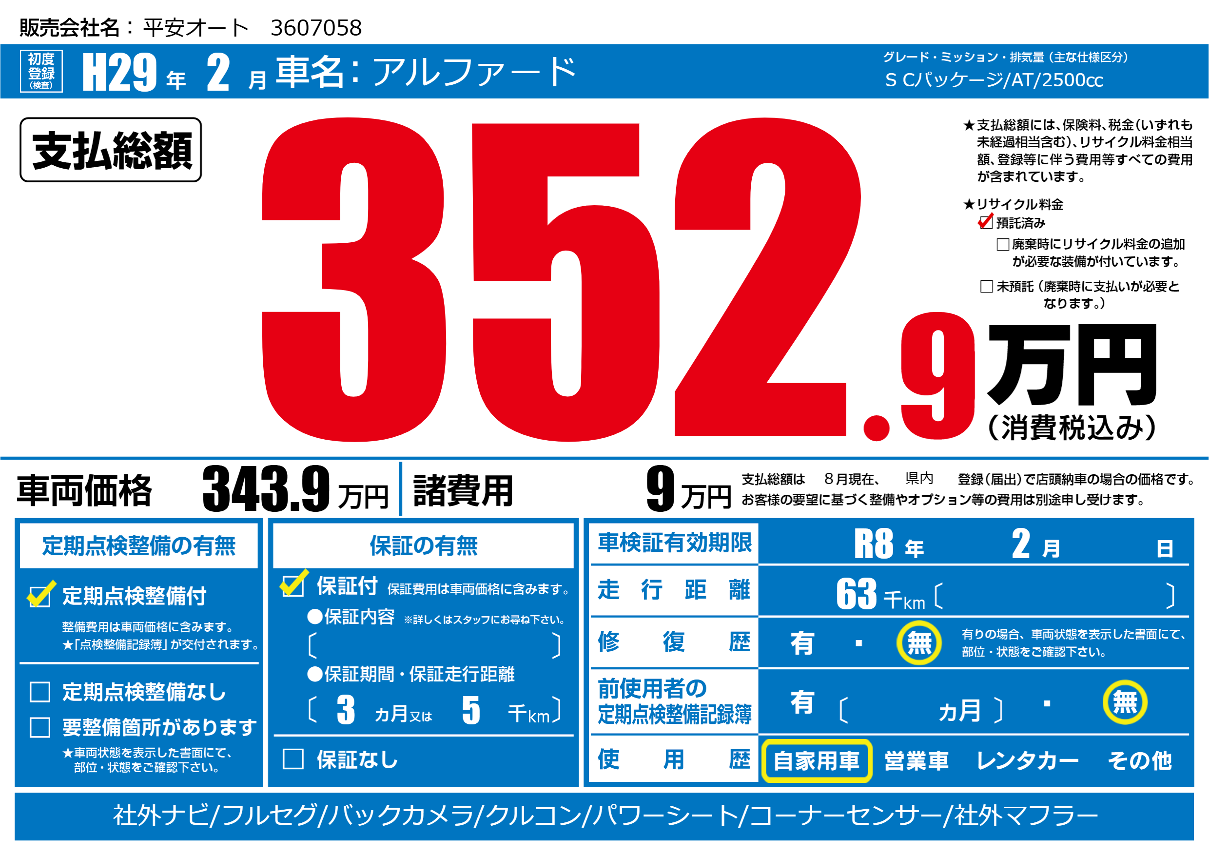 | 車検制限 | R8年 2月 - 日 | ||