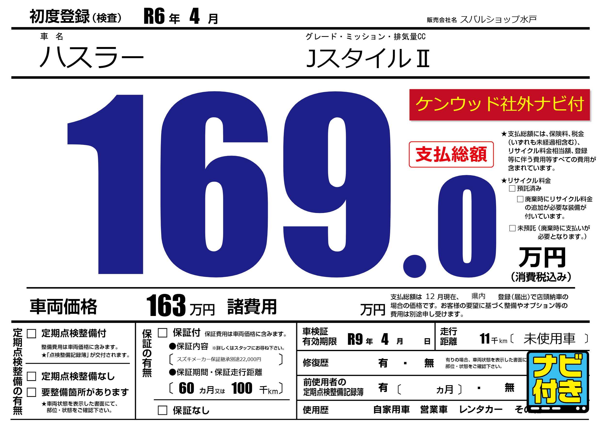 | 車名 | ハスラー | グレード ミッション 排気量 |