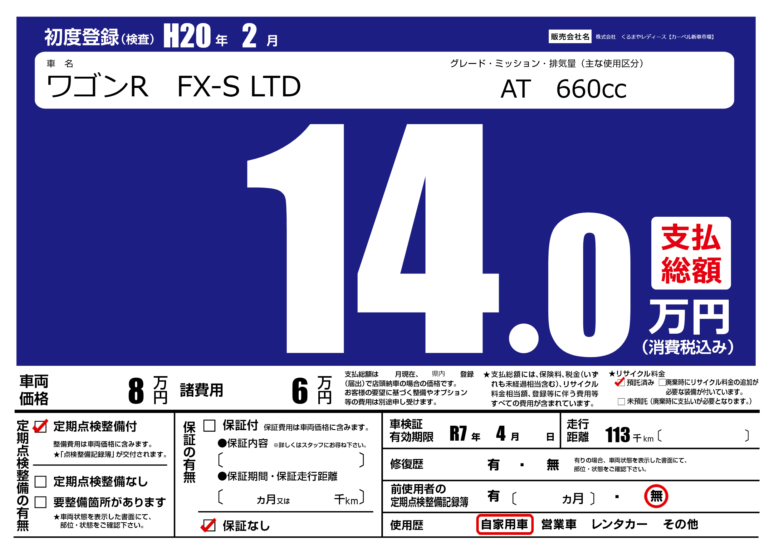 | 車名 | ワゴンR FX-S LTD | グレード ミッション 排気量 |