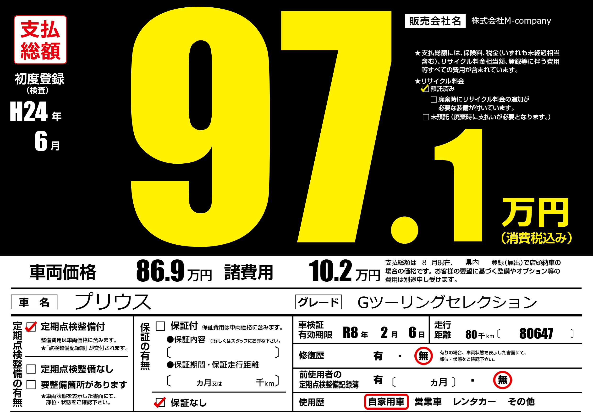 | 走行キロ | 8万km | 初年度登録 | H24年6月 |