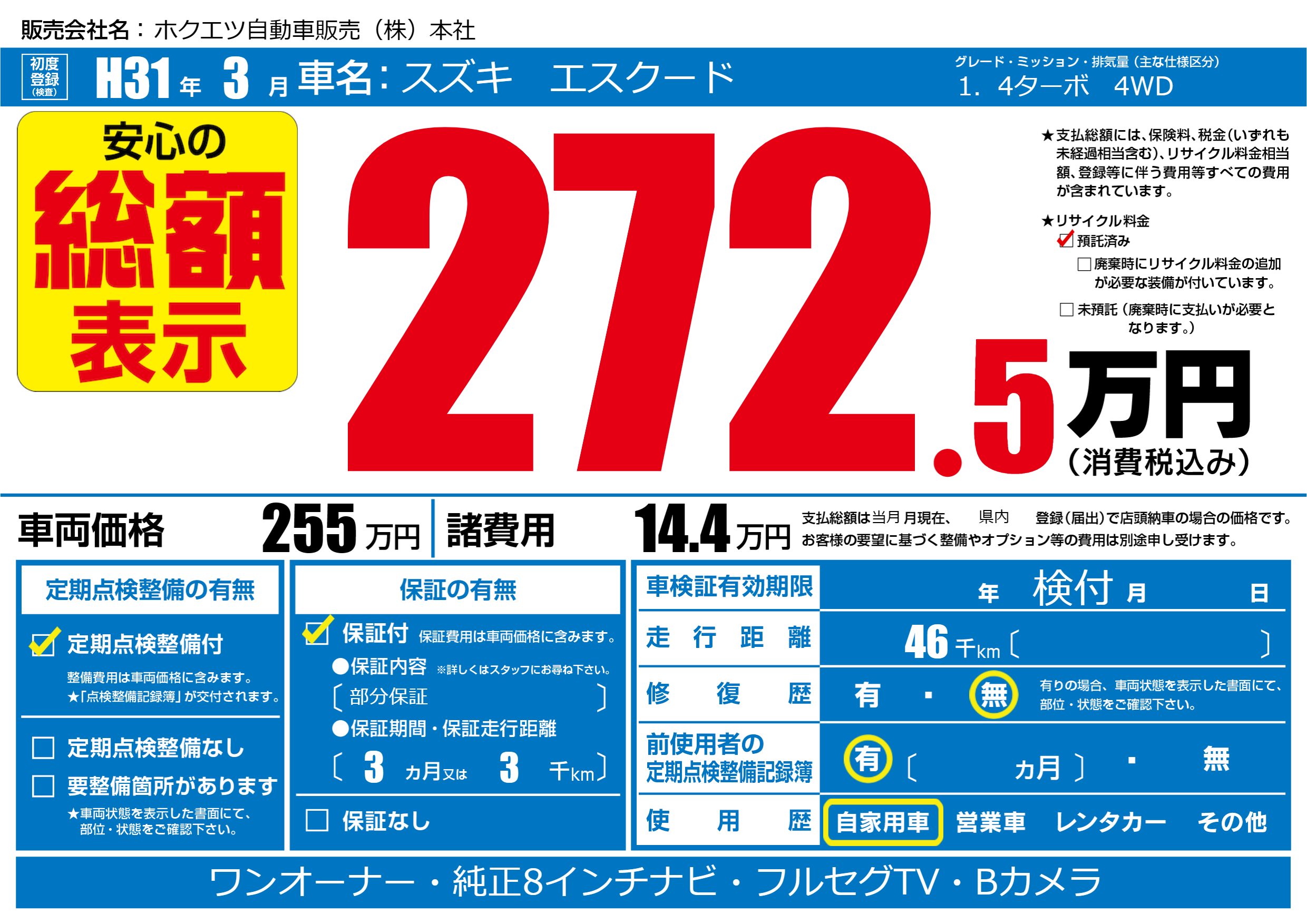 | 走行キロ | 4.6万km | 初年度登録 | H31年3月 |