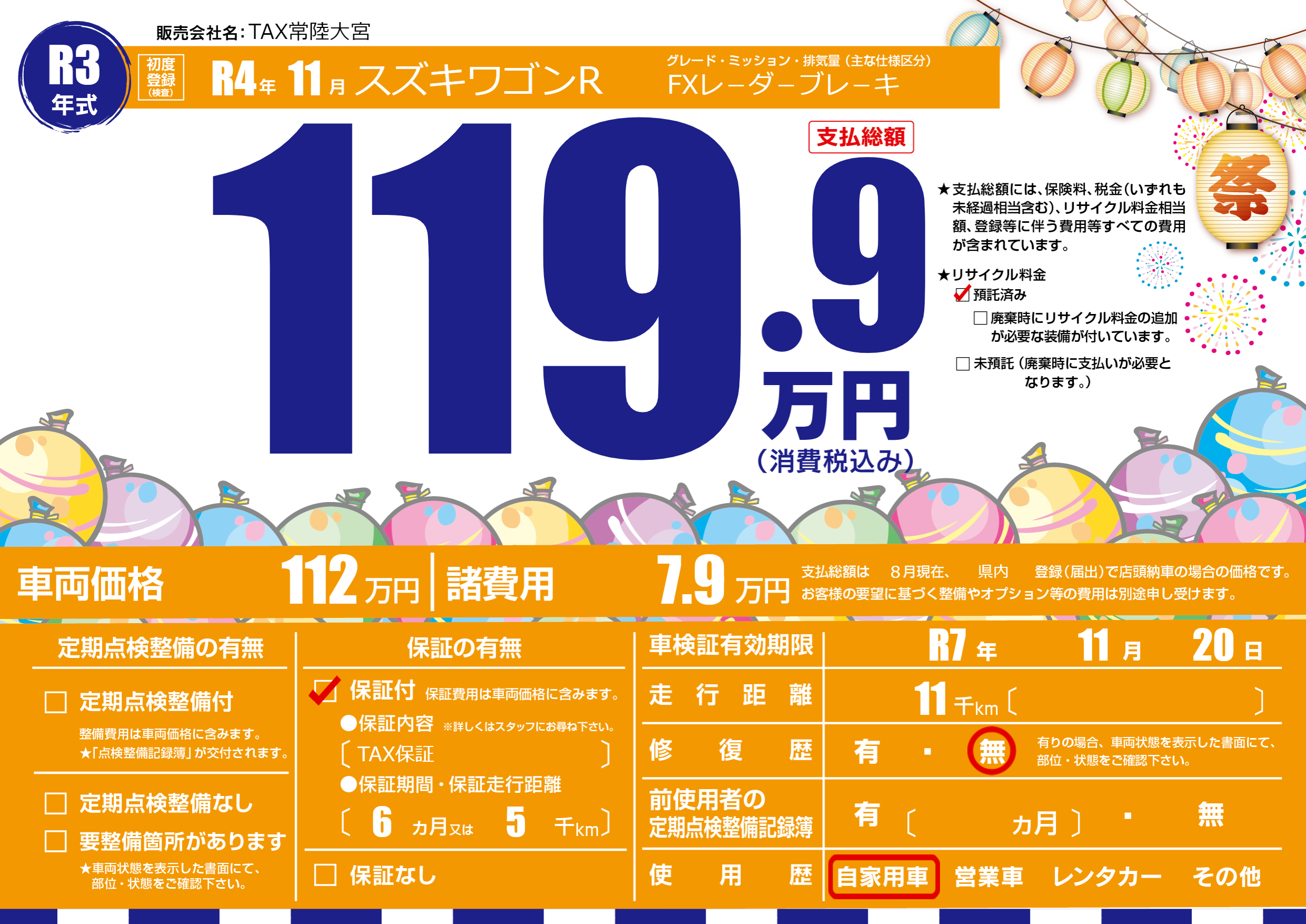 保証付き 保証内容(TAX保証) 6ヶ月または(5)千kmまで |