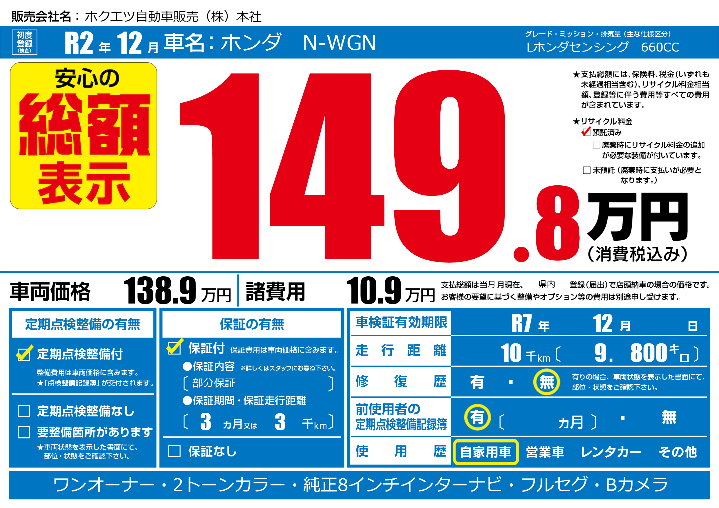 | 車名 | ホンダ N-WGN | グレード ミッション 排気量 |