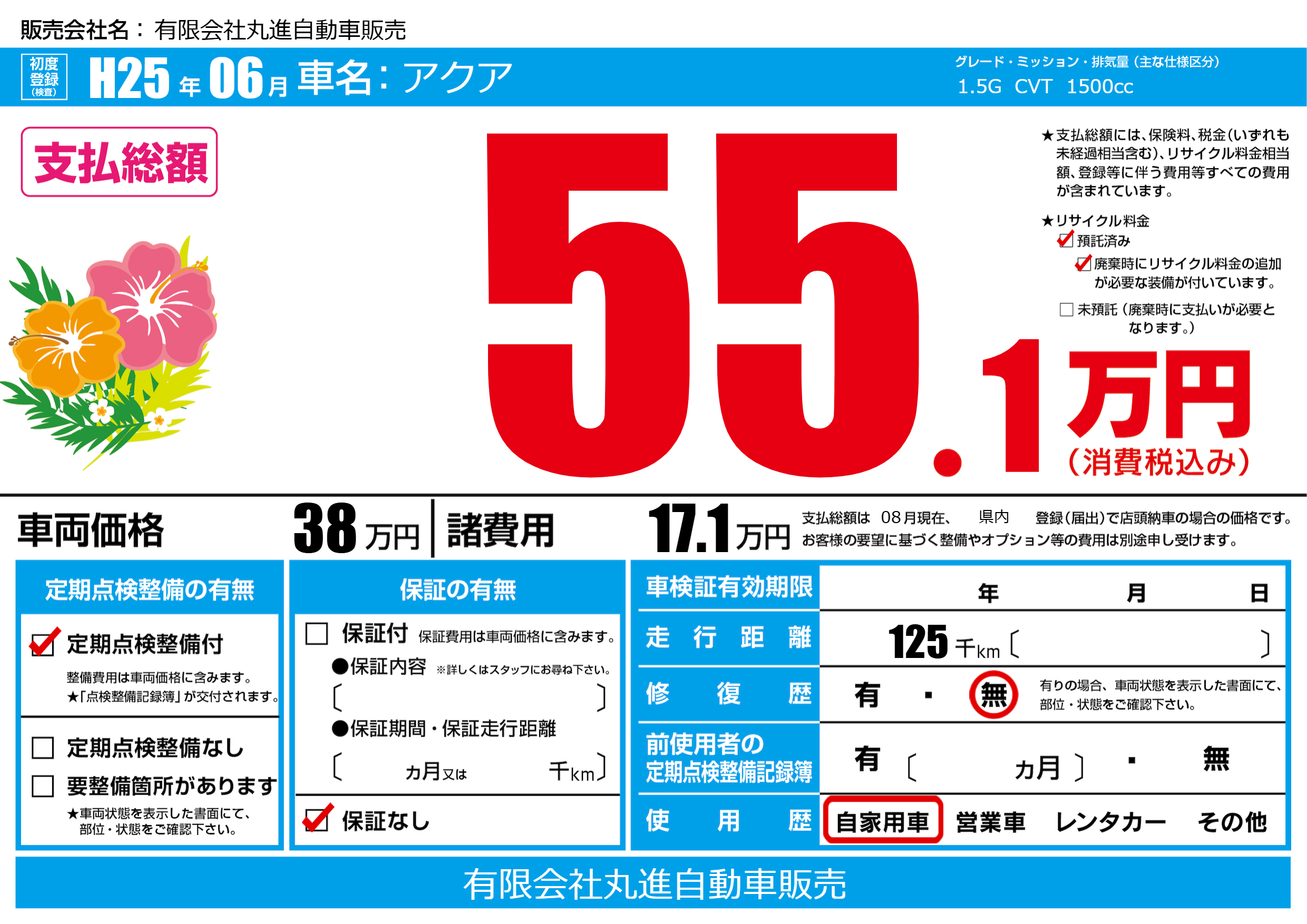 | 走行キロ | 12.5万km | 初年度登録 | H25年06月 |