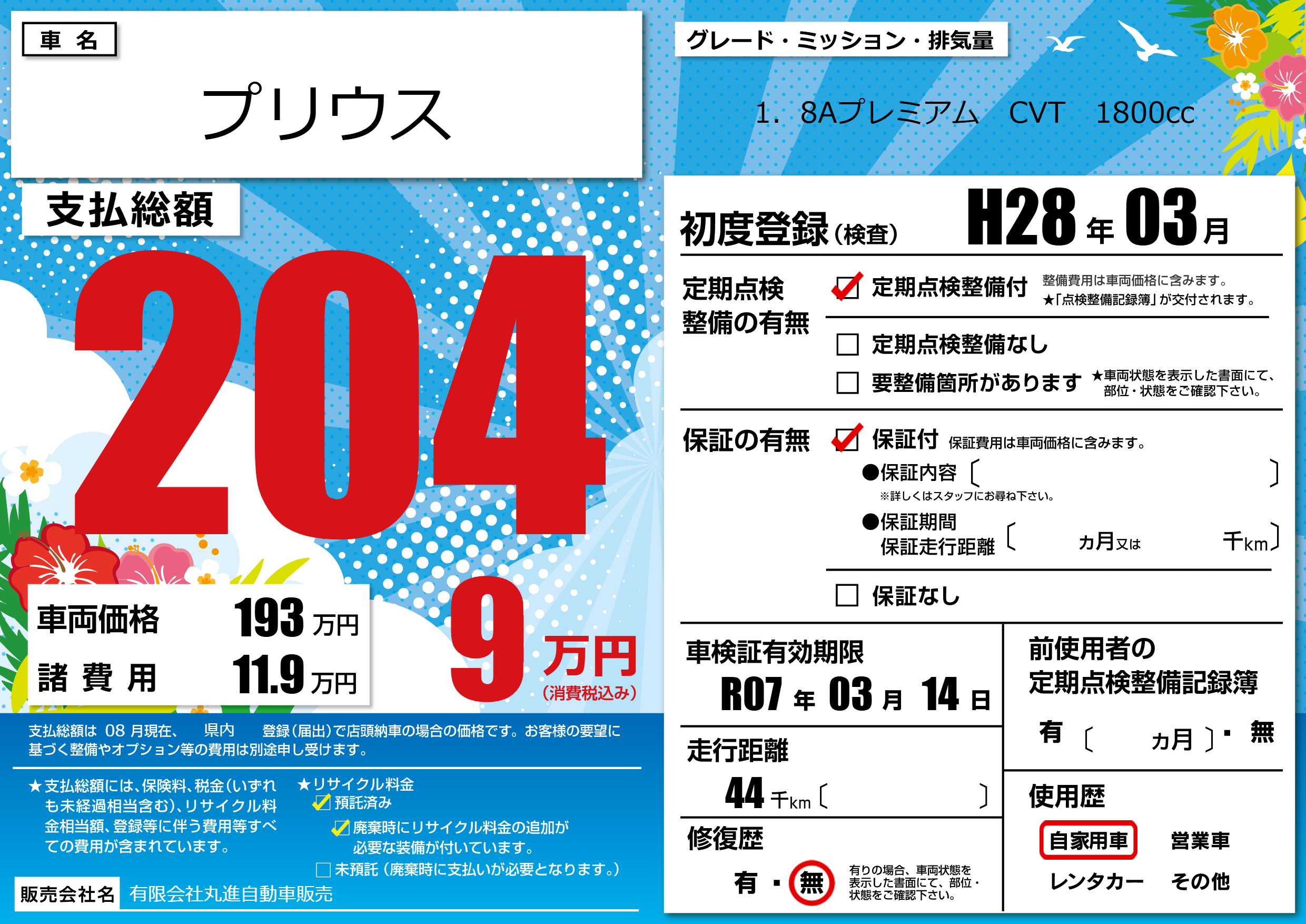 | 車名 | プリウス | グレード ミッション 排気量 |