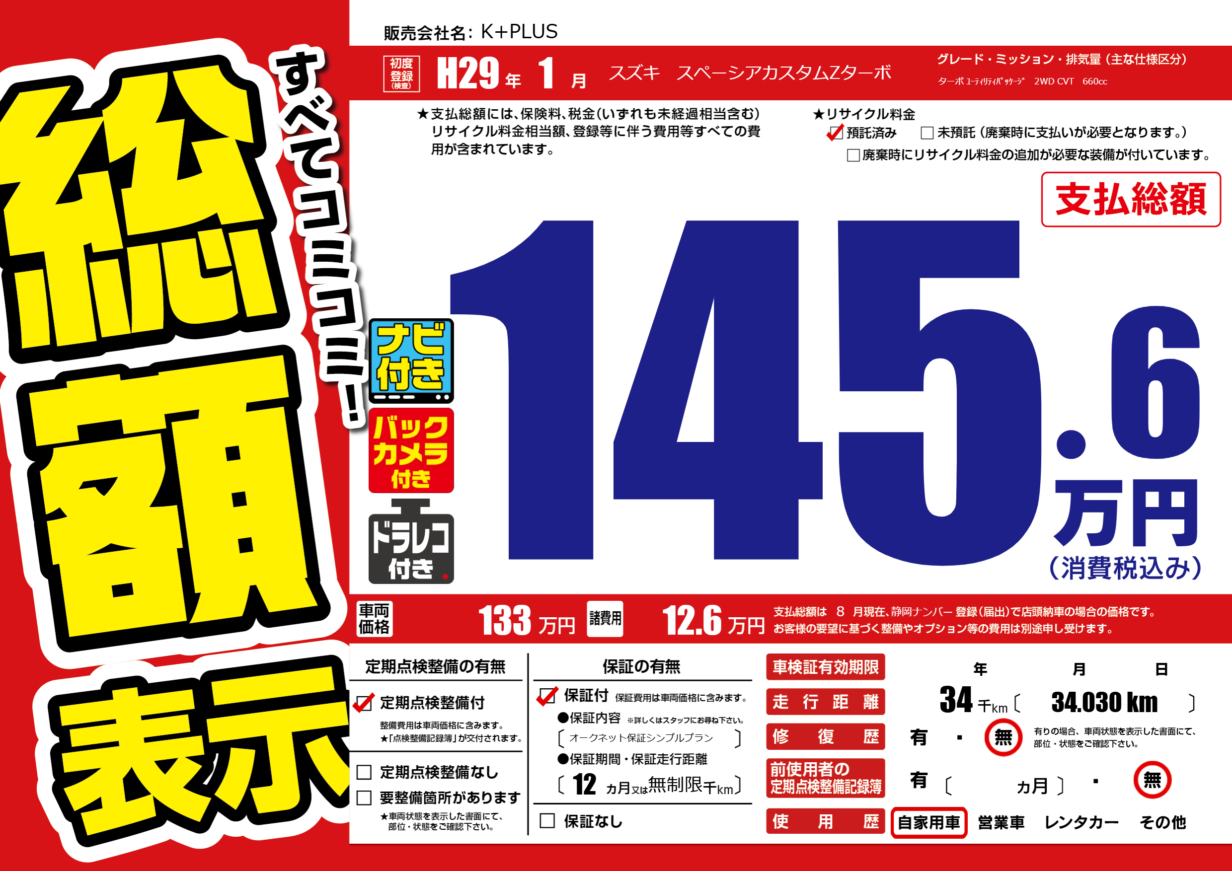 | 走行キロ | 3.4万km | 初年度登録 | H29年1月 |