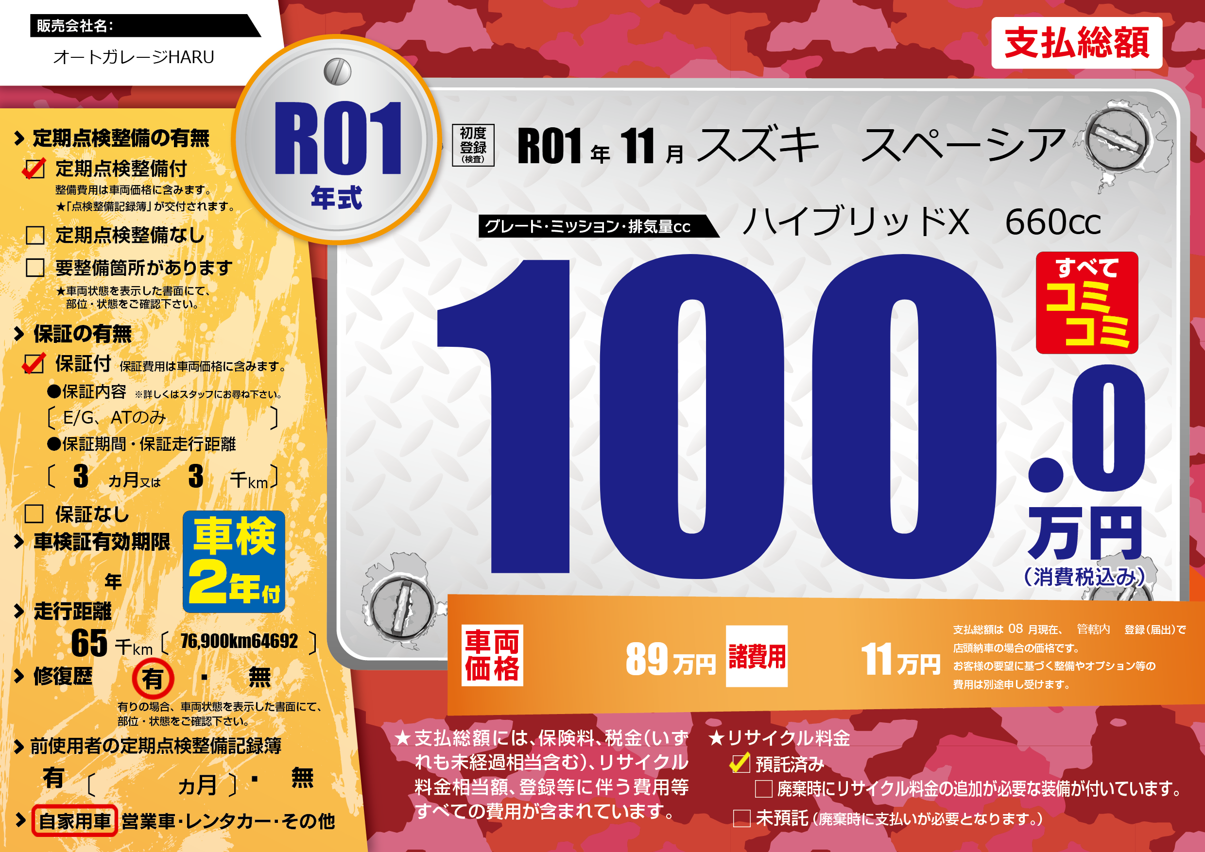 | 車名 | スズキ スペーシア | グレード ミッション 排気量 |