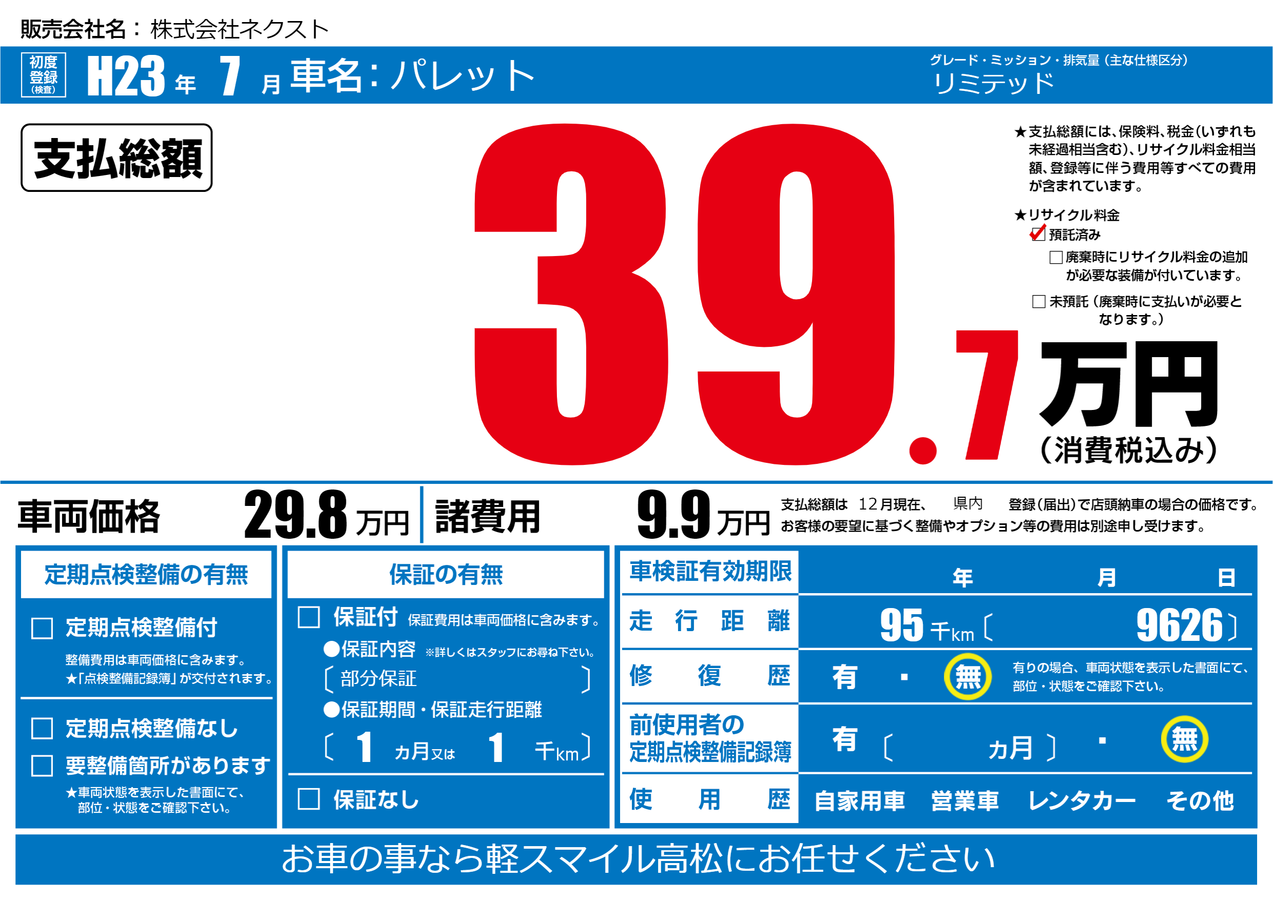 | 走行キロ | 9.5万km | 初年度登録 | H23年7月 |