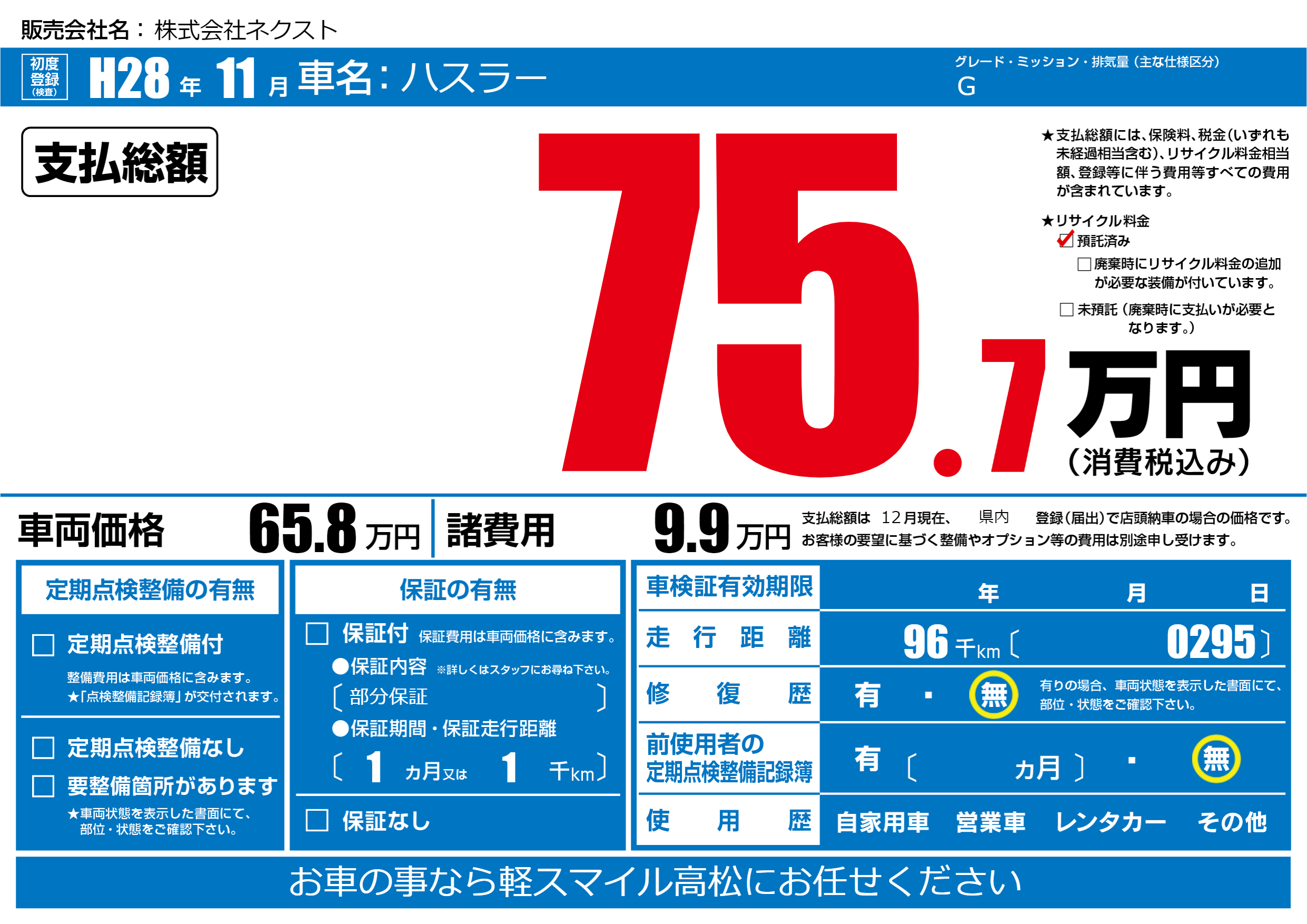| 車名 | ハスラー | グレード ミッション 排気量 |