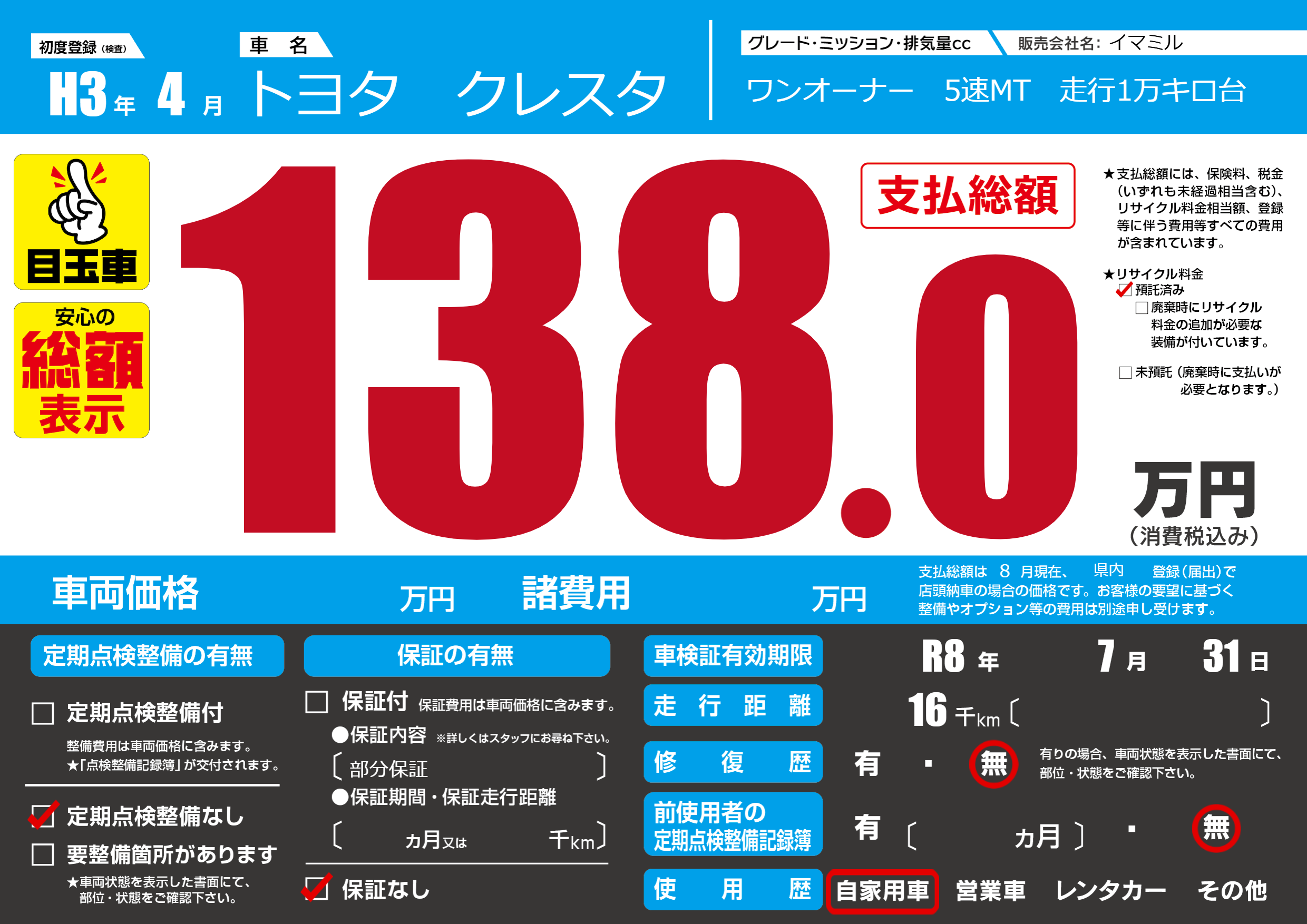 | 車名 | トヨタ クレスタ | グレード ミッション 排気量 |