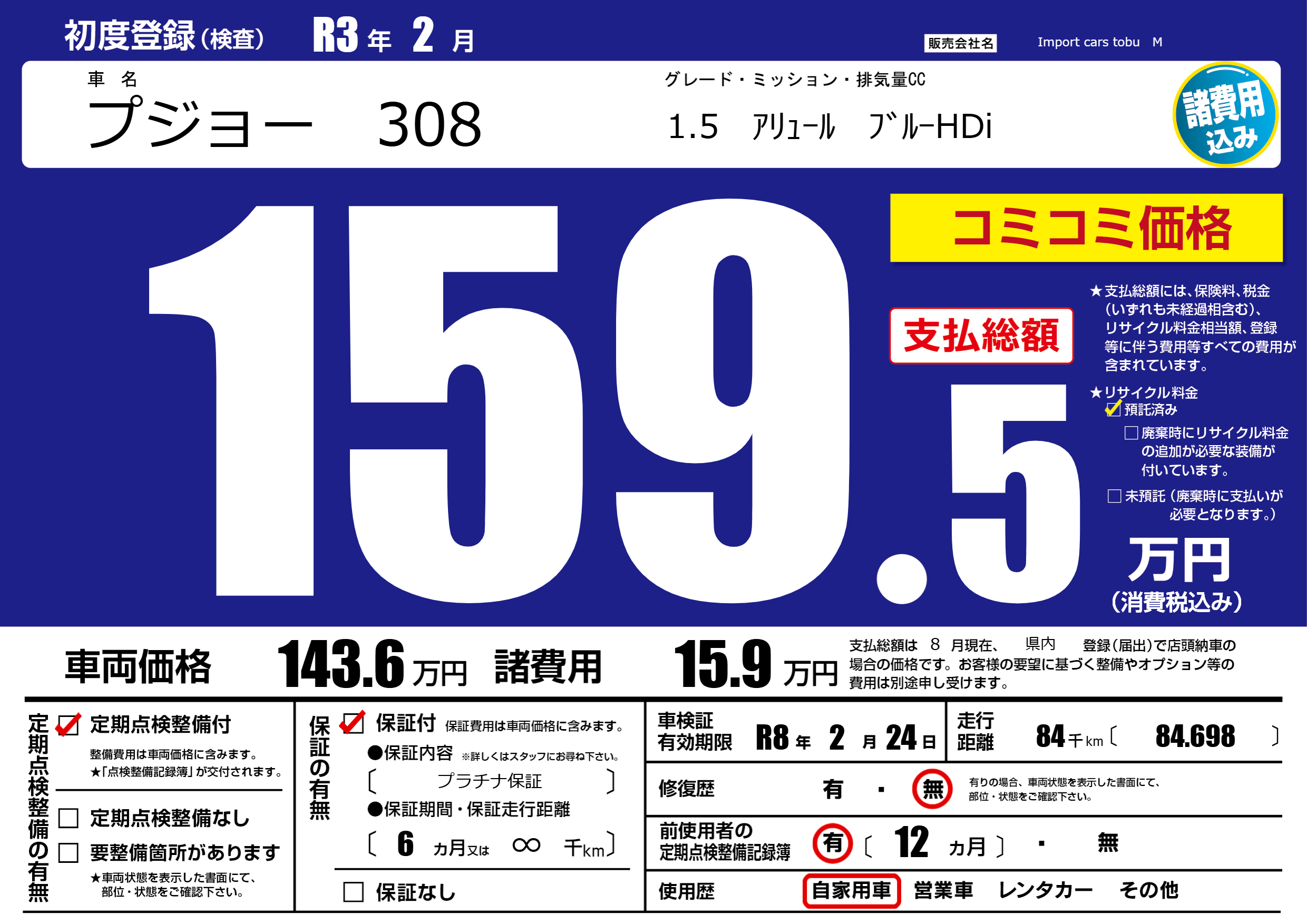 | 車名 | プジョー 308 | グレード ミッション 排気量 |