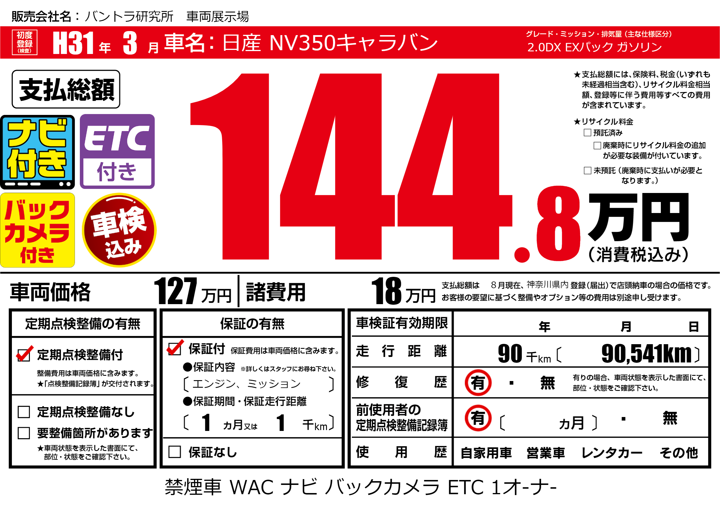 | 走行キロ | 9万km | 初年度登録 | H31年3月 |