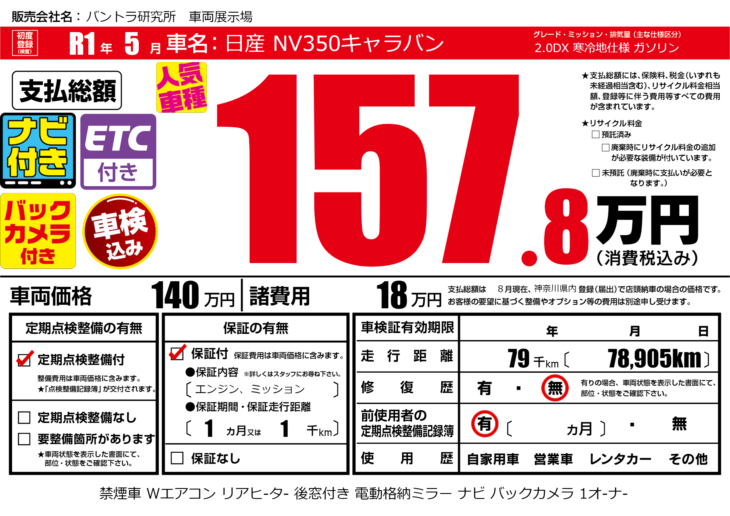 | 車名 | 日産 NV350キャラバン | グレード ミッション 排気量 |