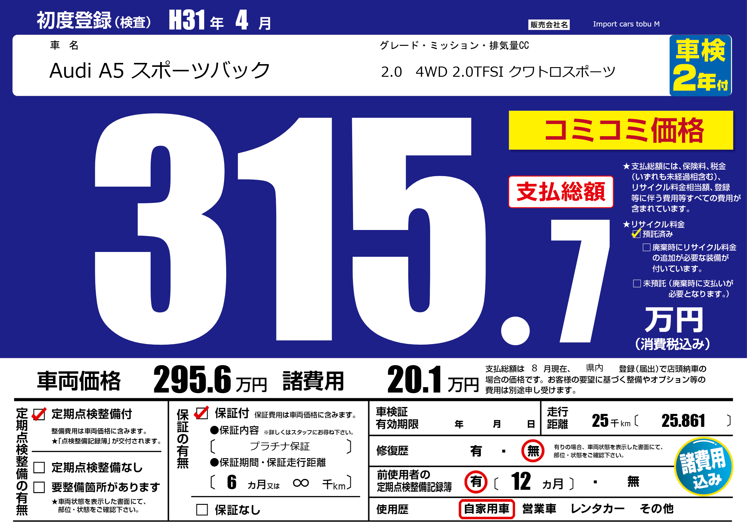 | 車名 | Audi A5 スポーツバック | グレード ミッション 排気量 |
