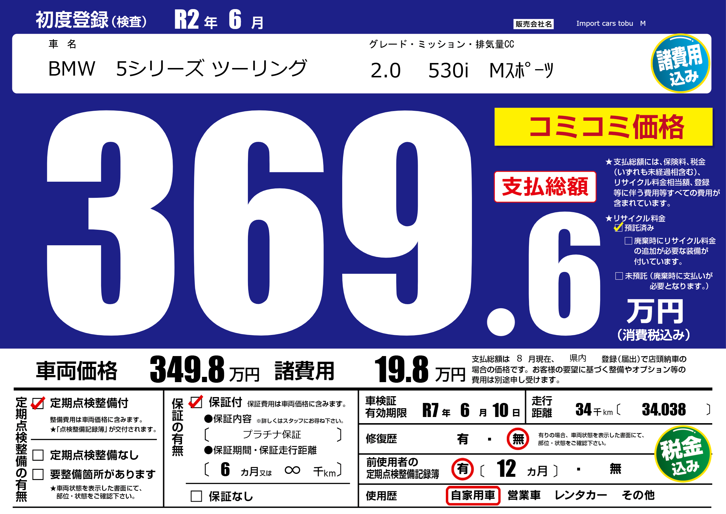 | 車名 | BMW 5シリーズ ツーリング | グレード ミッション 排気量 |
