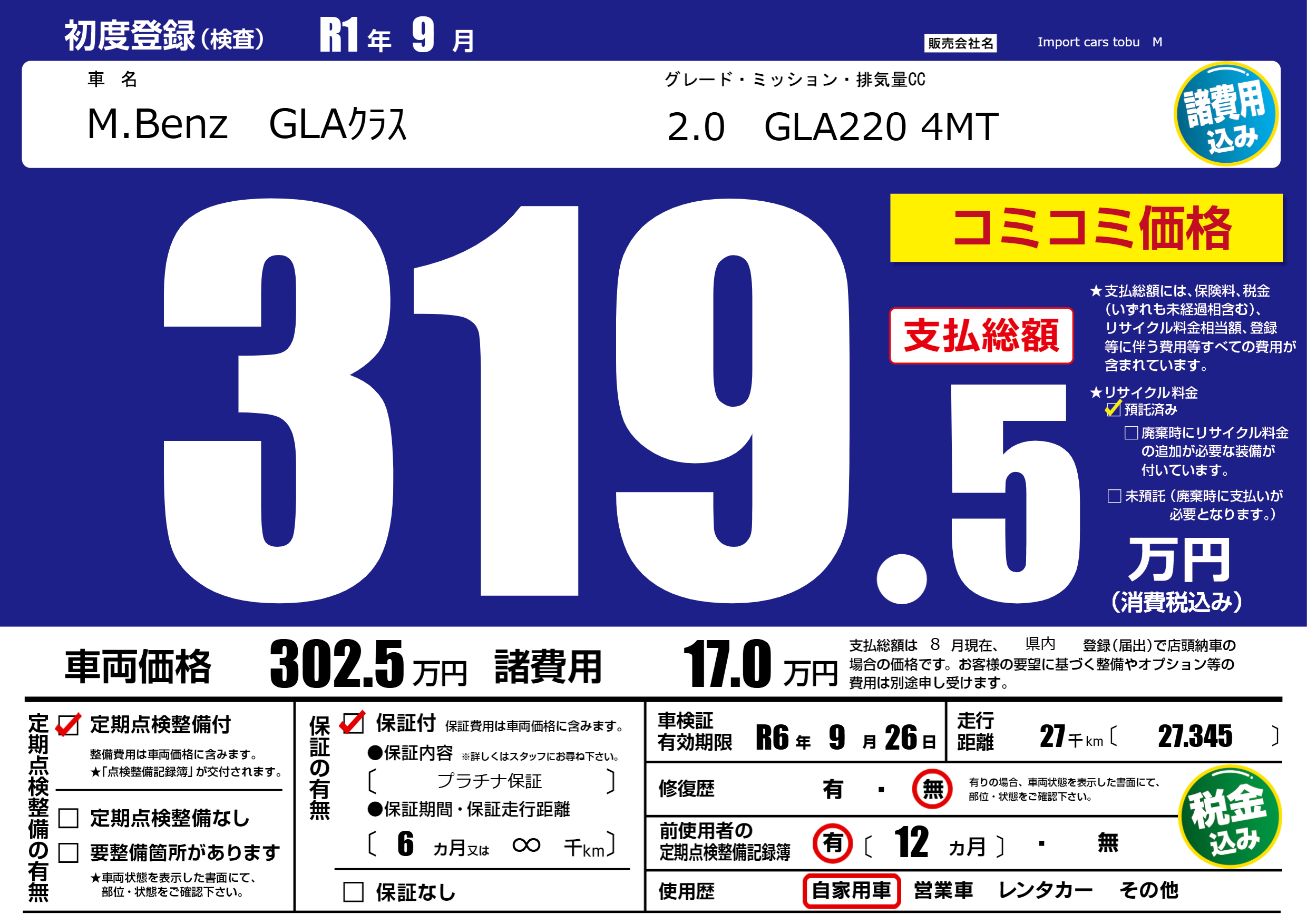 | 車名 | M.Benz GLAクラス | グレード ミッション 排気量 |