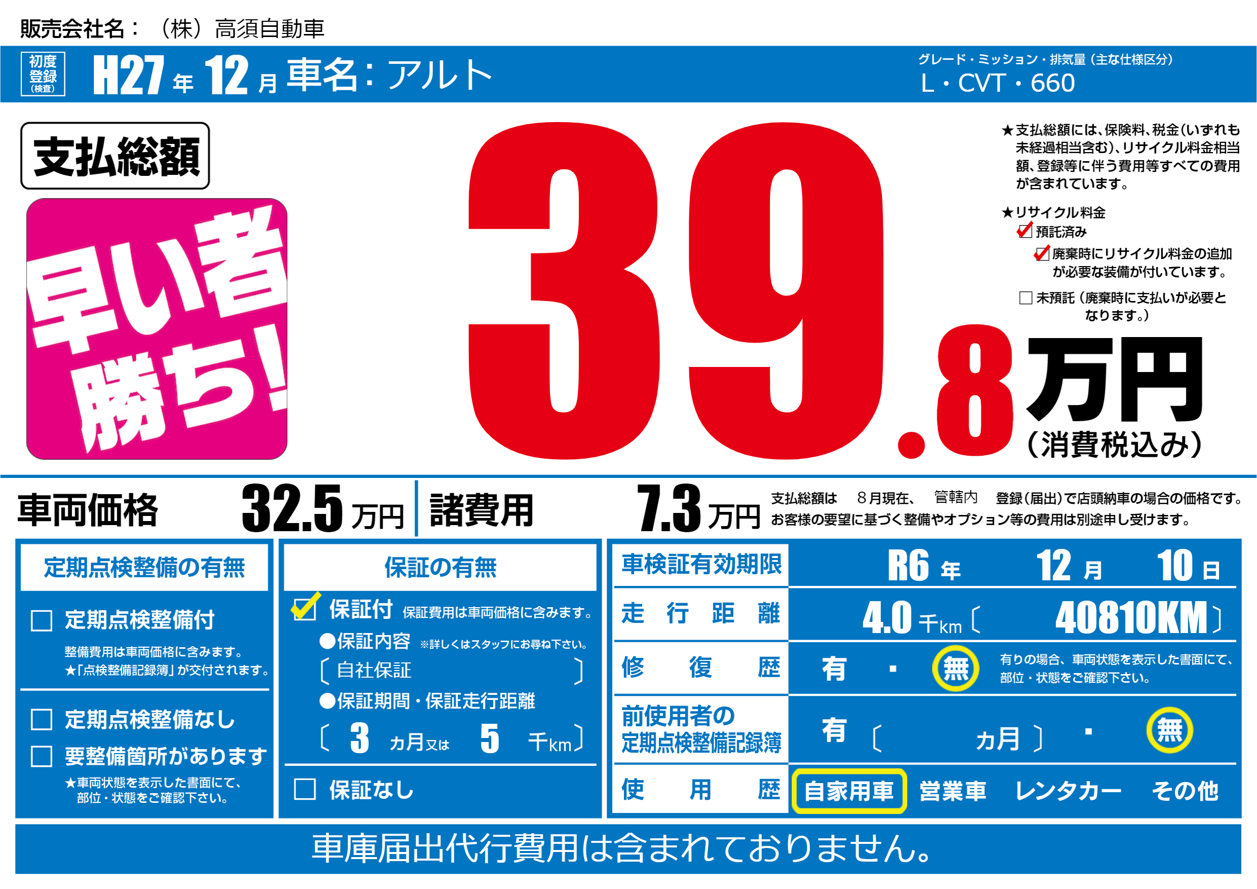 | 走行キロ | 0.4万km | 初年度登録 | H27年12月 |