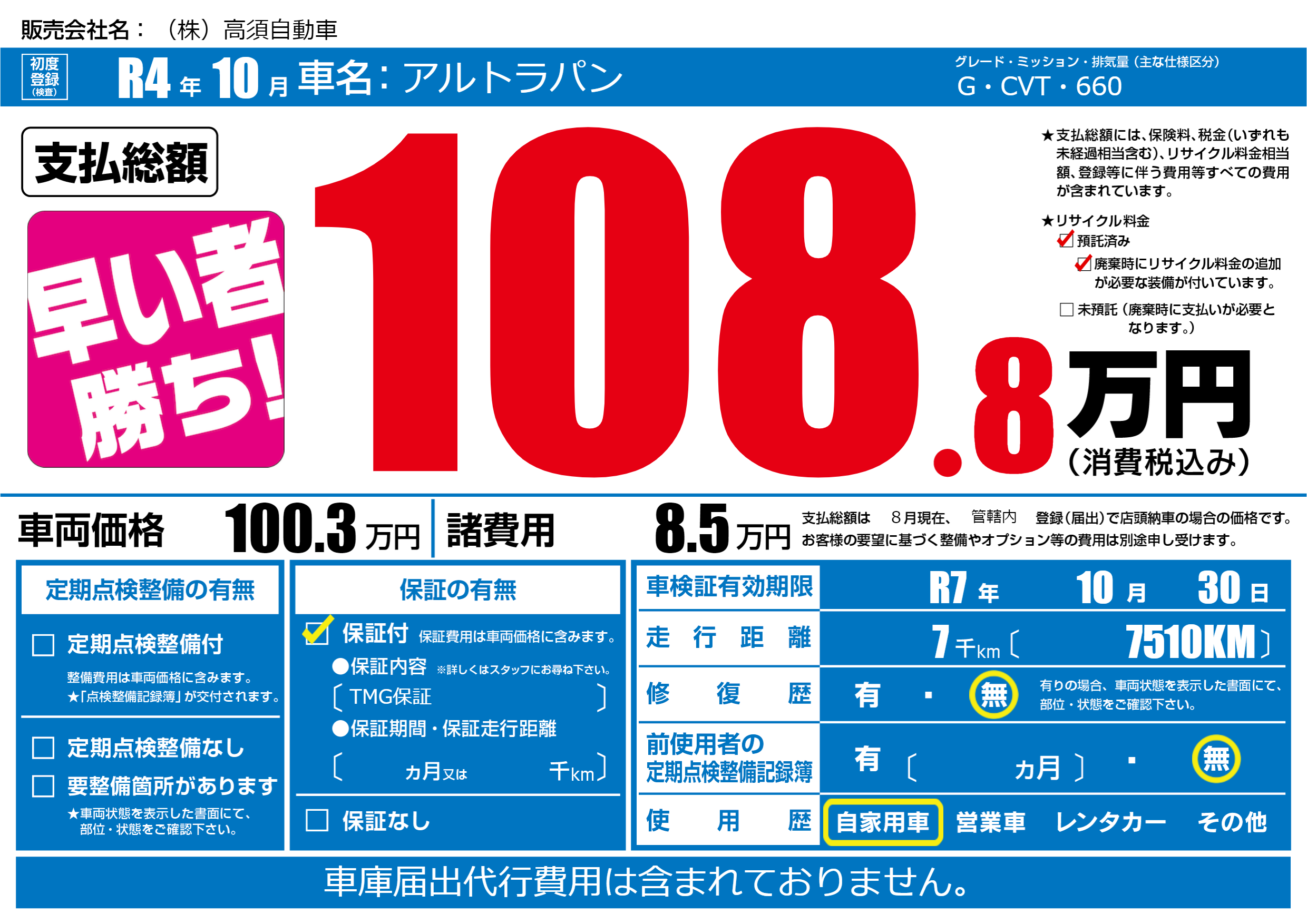 保証付き 保証内容(TMG保証) ---ヶ月または()千kmまで |
