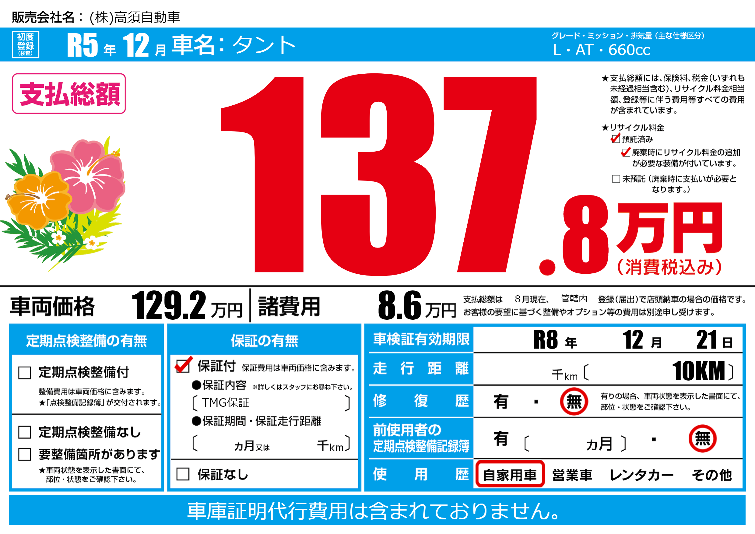 保証付き 保証内容(TMG保証) ---ヶ月または()千kmまで |