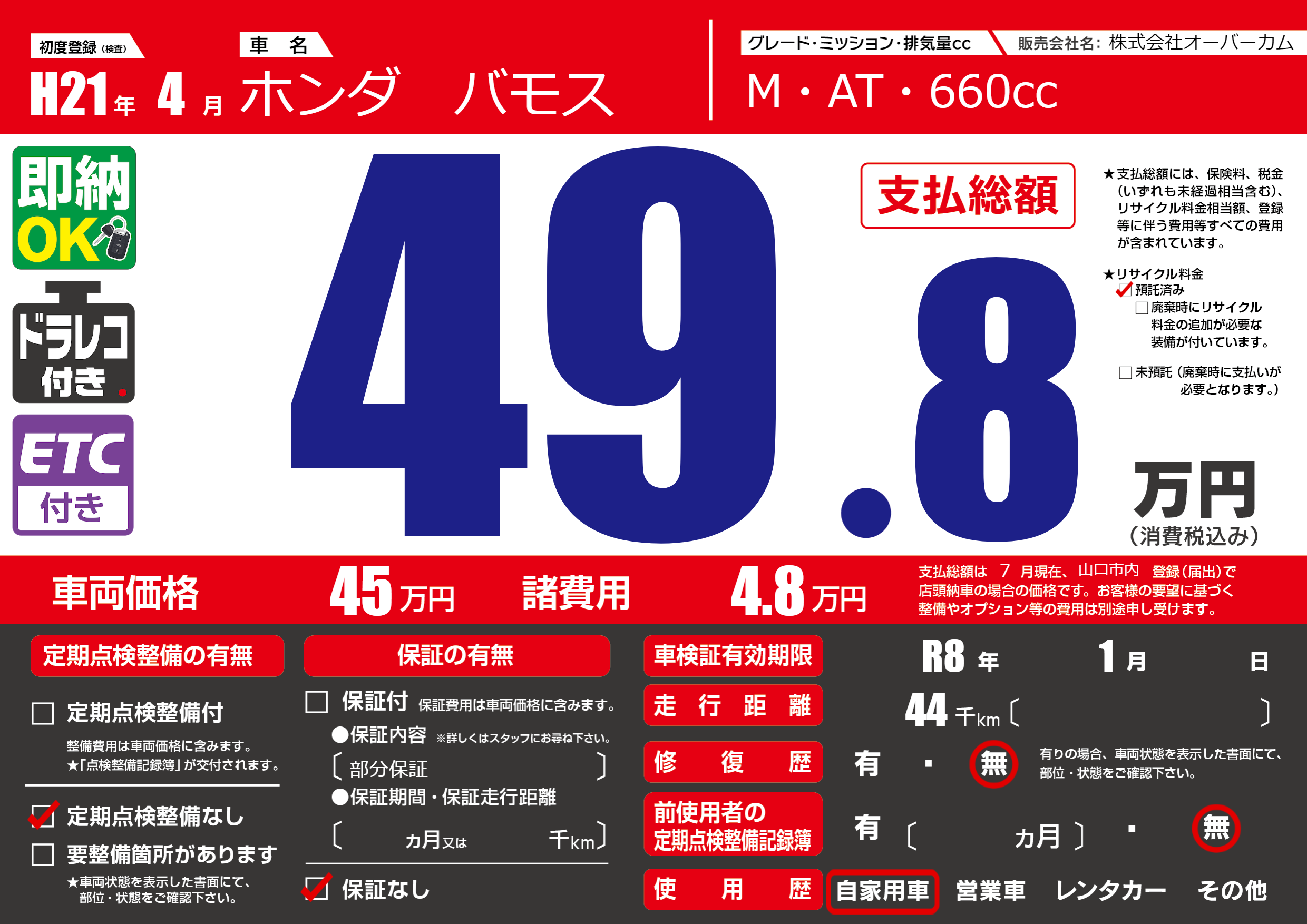 なし | 車検制限 | R8年1月---月 |