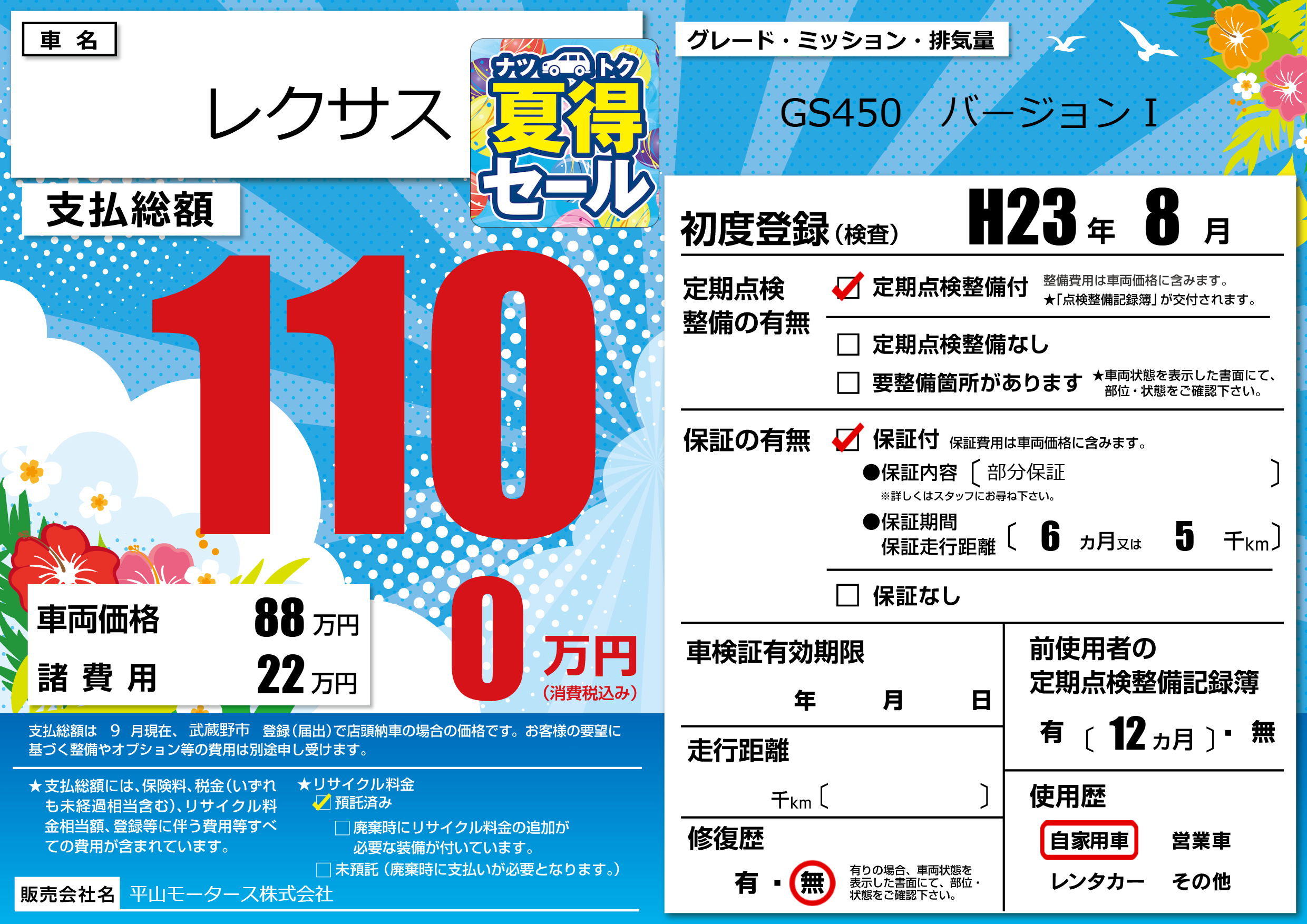 | 走行キロ | - | 初年度登録 | H23年8月 |