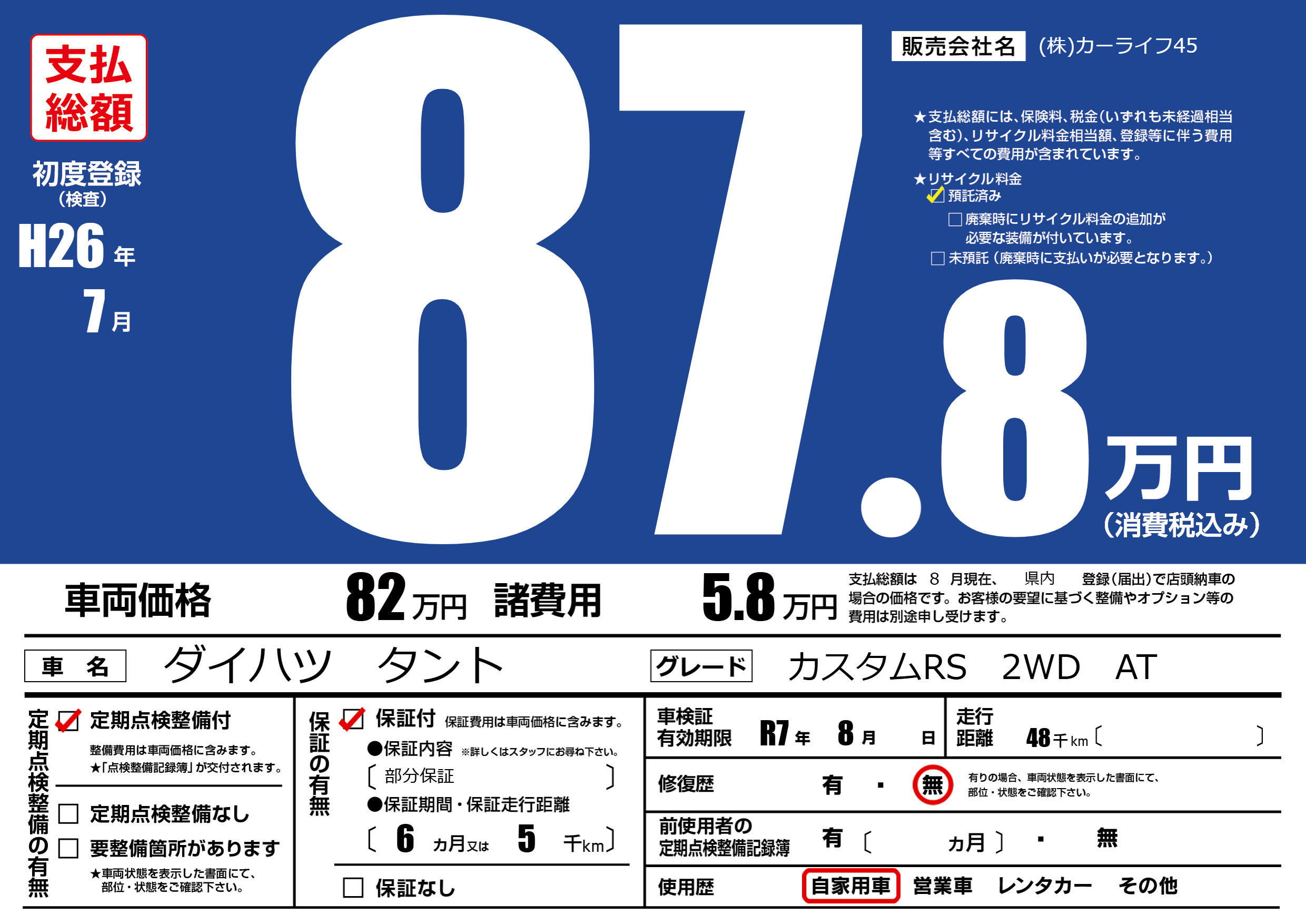 | 走行キロ | 4.8万km | 初年度登録 | H26年7月 |