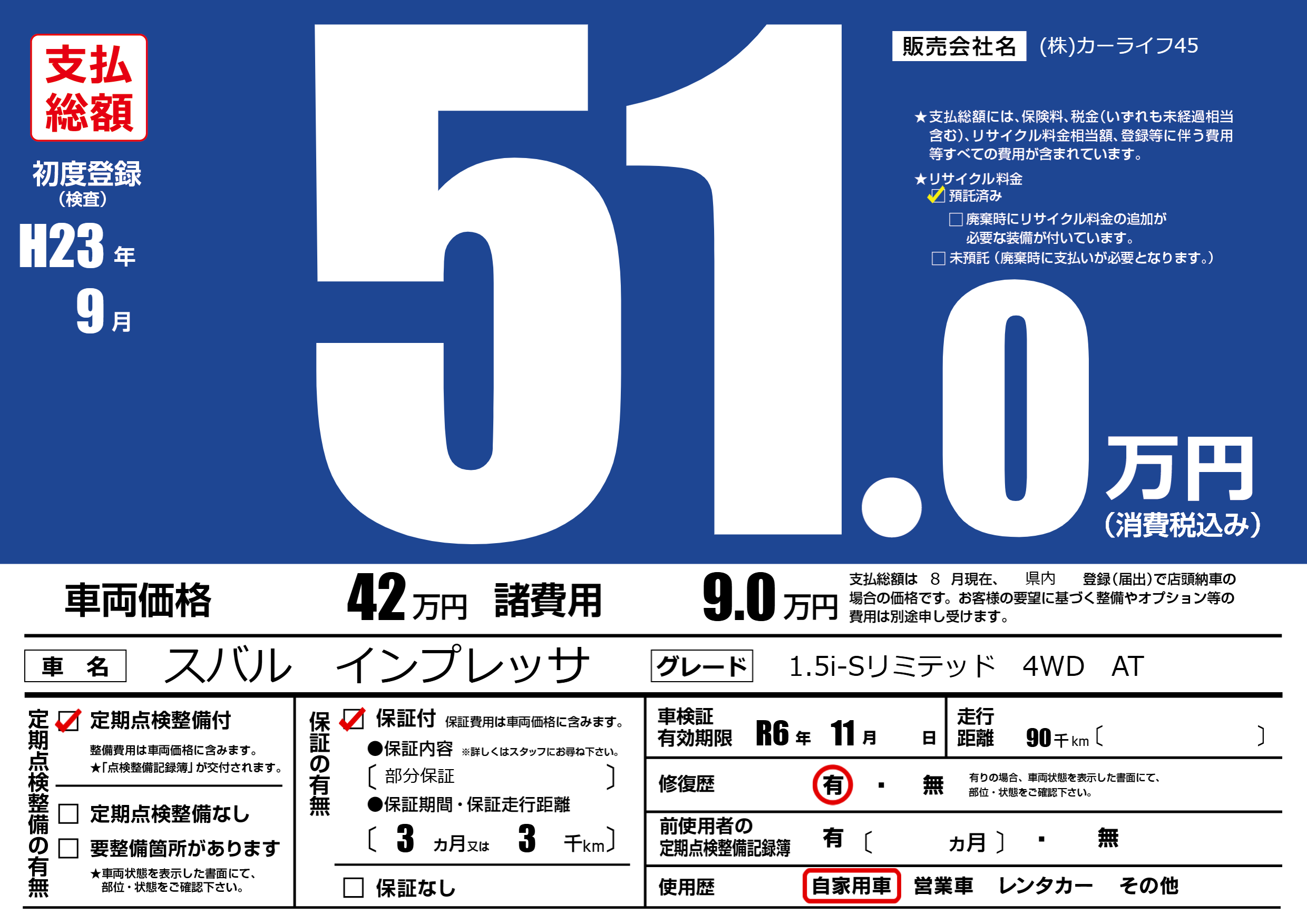 | 車名 | スバル インプレッサ | グレード ミッション 排気量 |