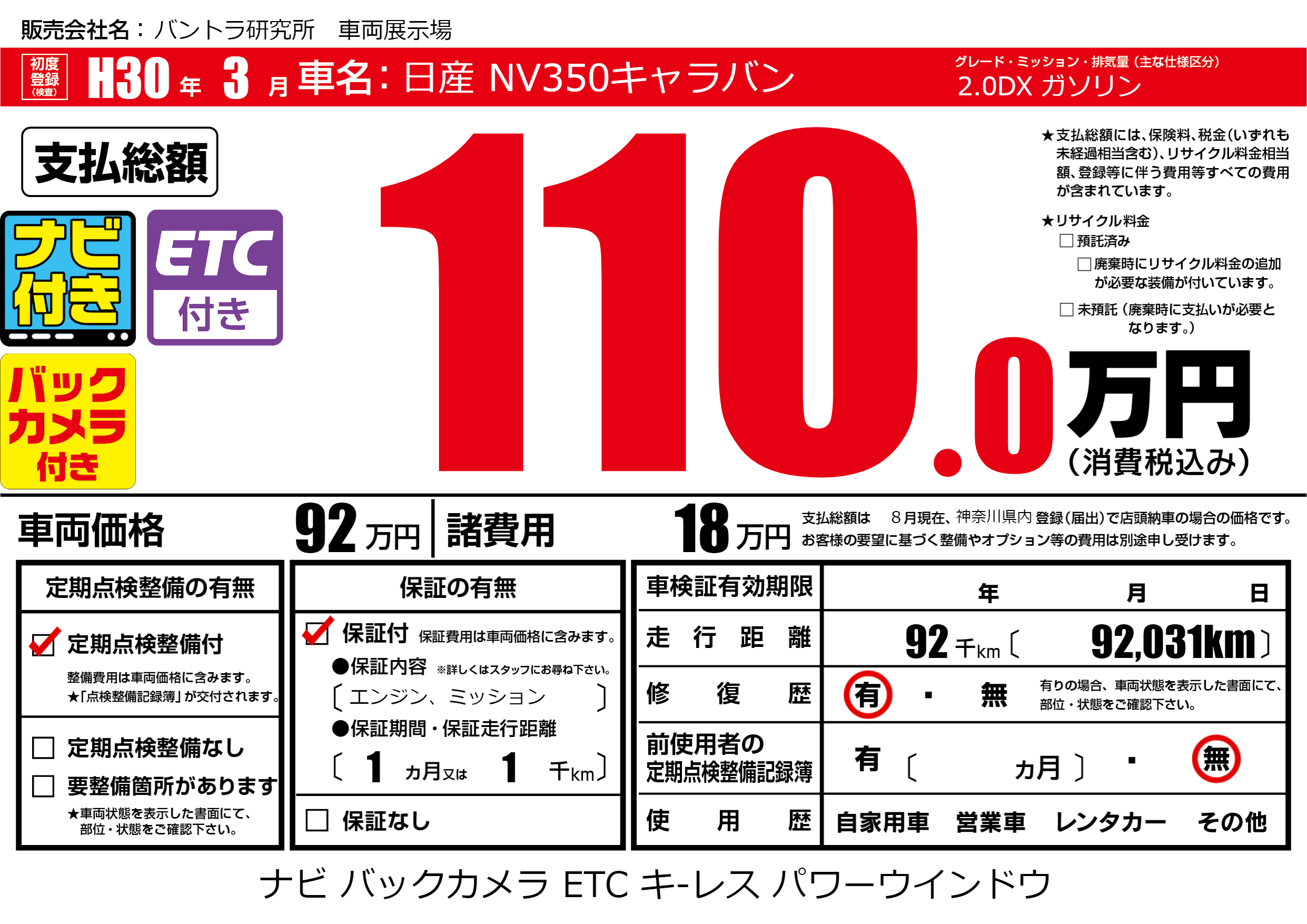 | 走行キロ | 9.2万km | 初年度登録 | H30年3月 |