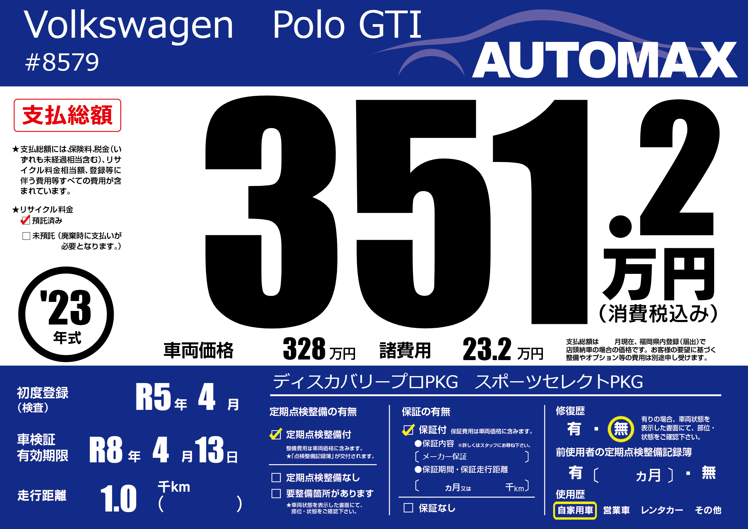 | 車名 | Volkswagen Polo GTI | グレード ミッション 排気量 |