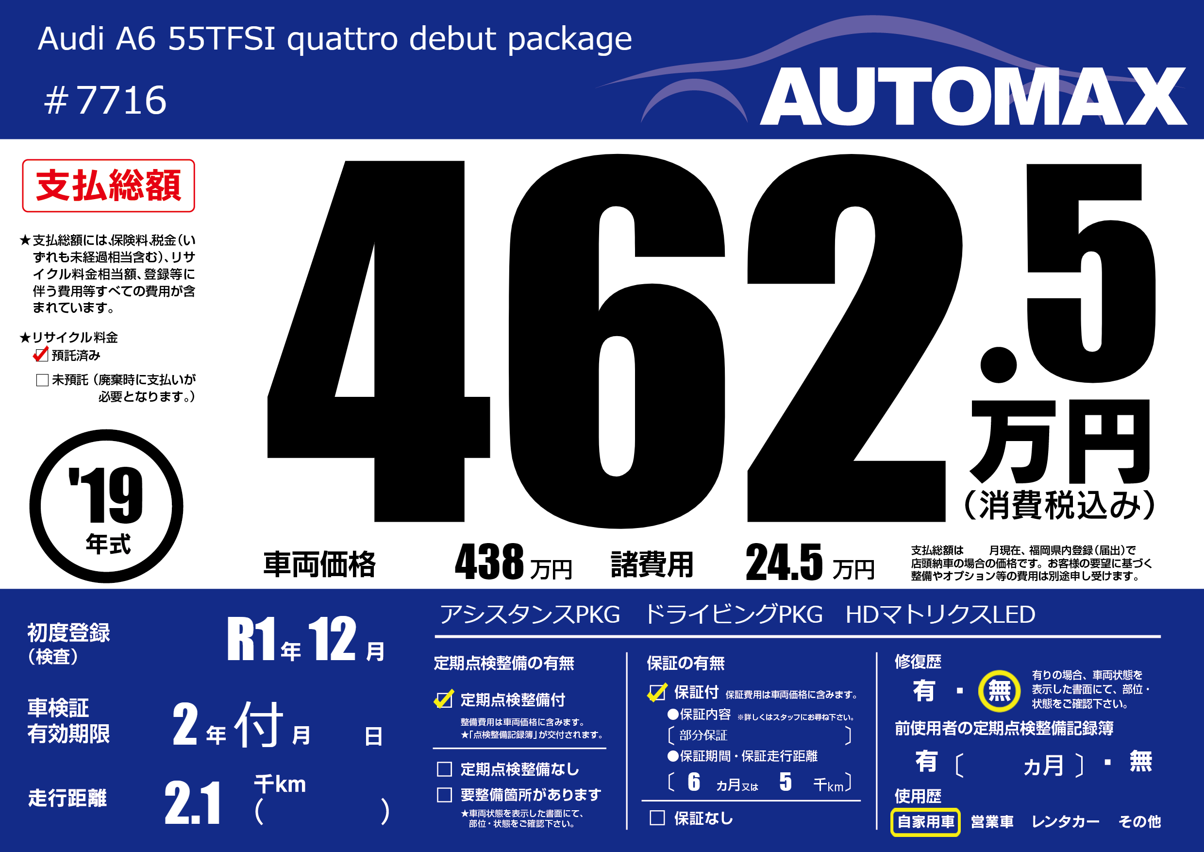 | 車名 | Audi A6 55TFSI quattro debut package | グレード ミッション 排気量 |