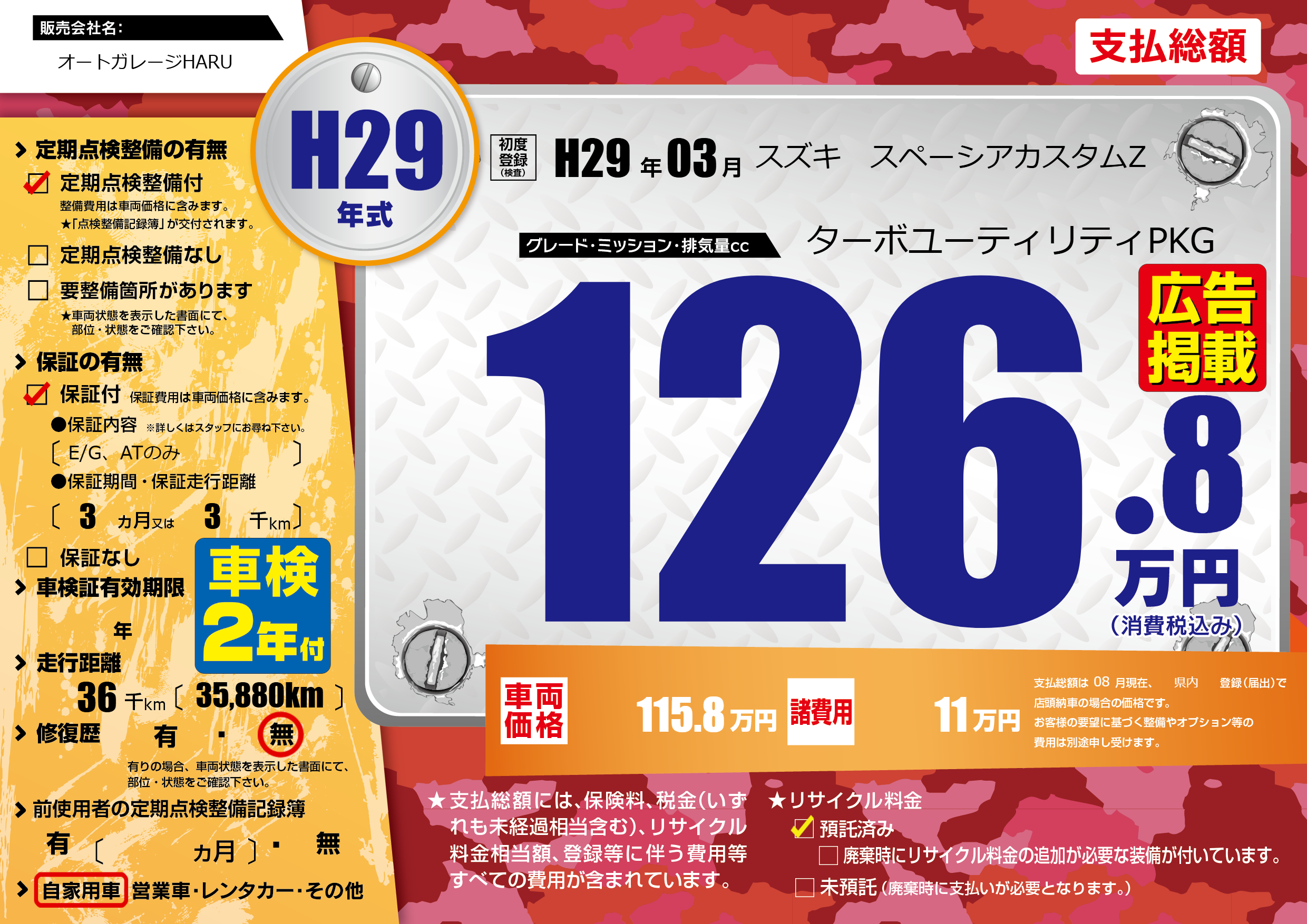 | 走行キロ | 3.6万km | 初年度登録 | H29年03月 |