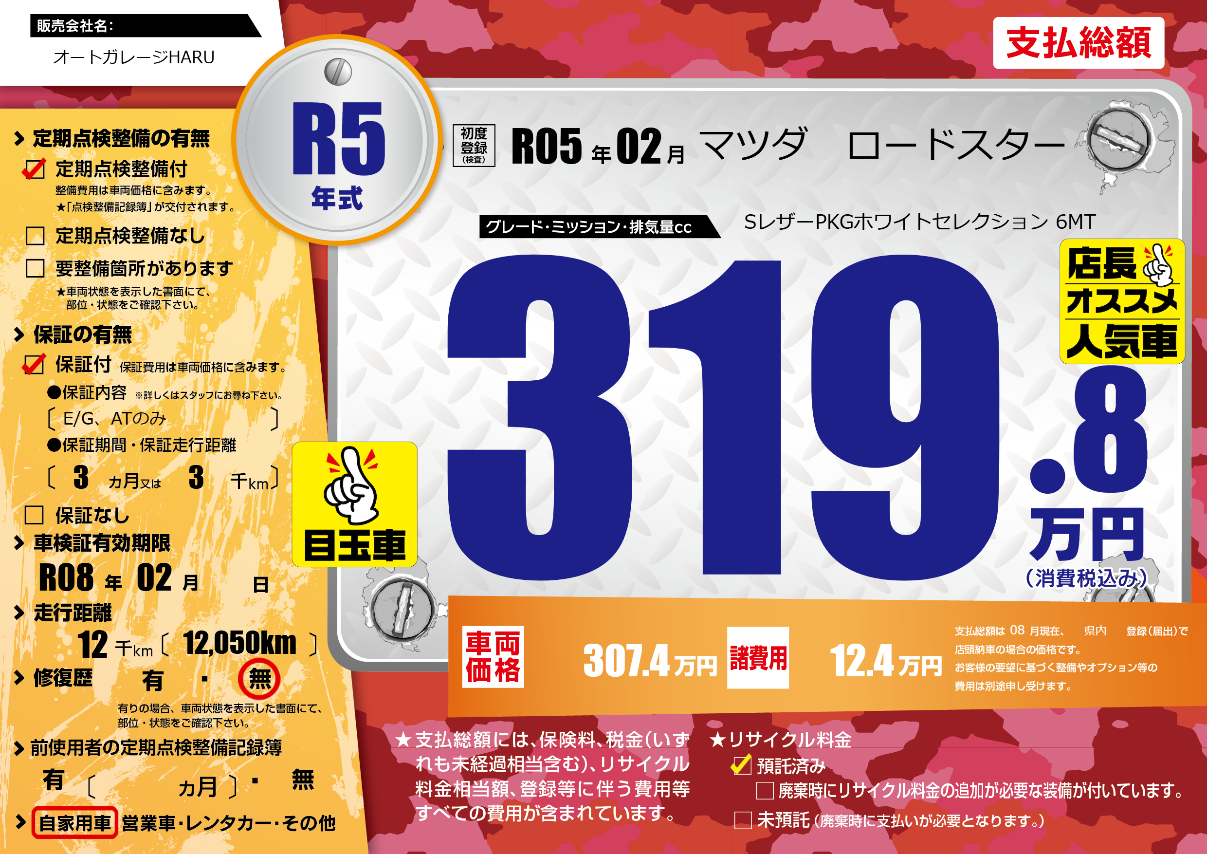 | 走行キロ | 1.2万km | 初年度登録 | R05年02月 |