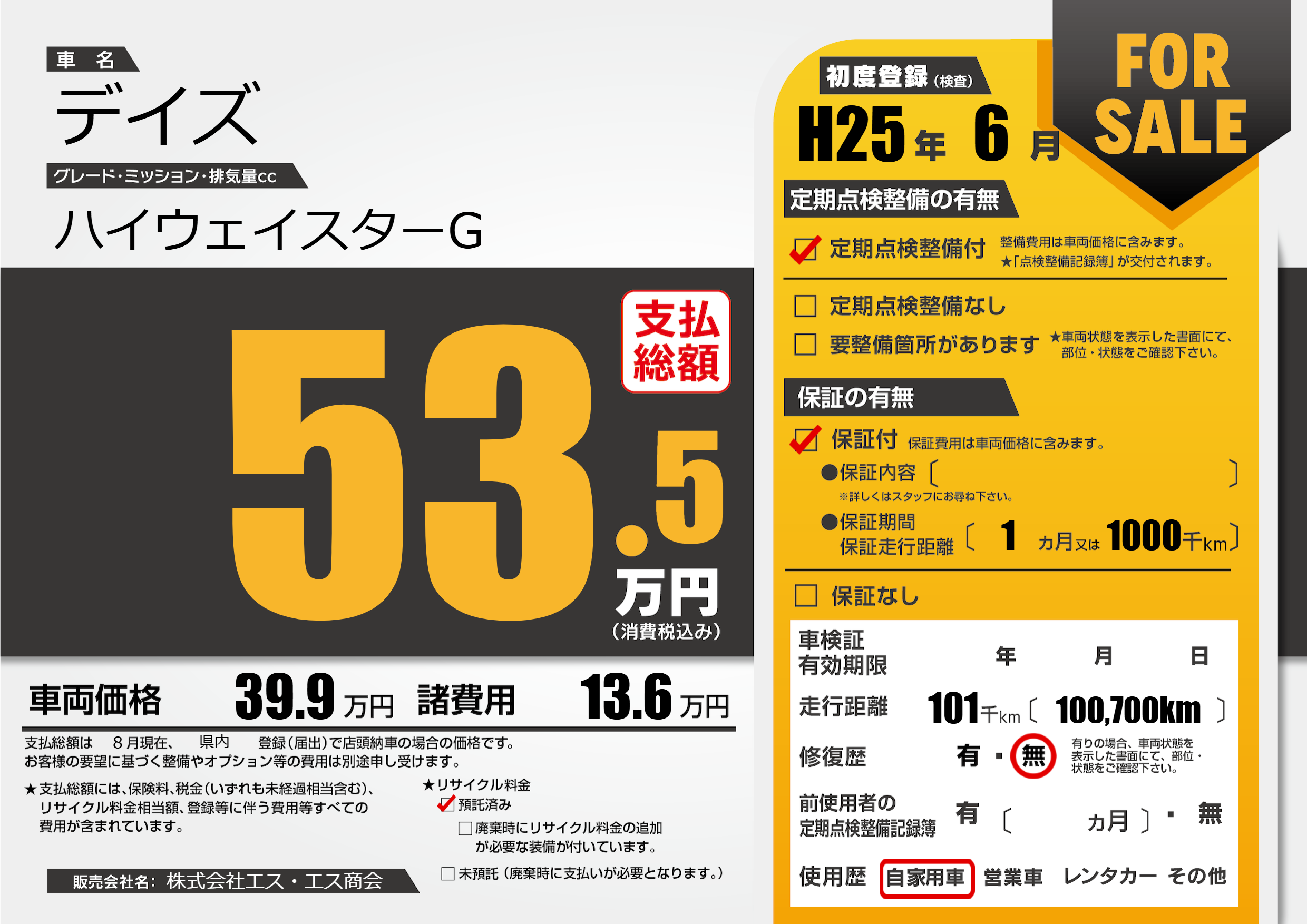 | 走行キロ | 10.1万km | 初年度登録 | H25年6月 |
