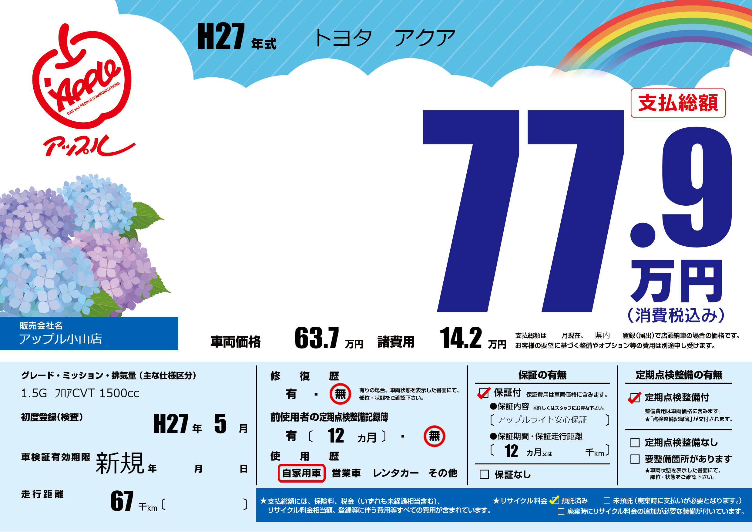 保証付き 保証内容(アップルライト安心保証) 12ヶ月または()千kmまで |