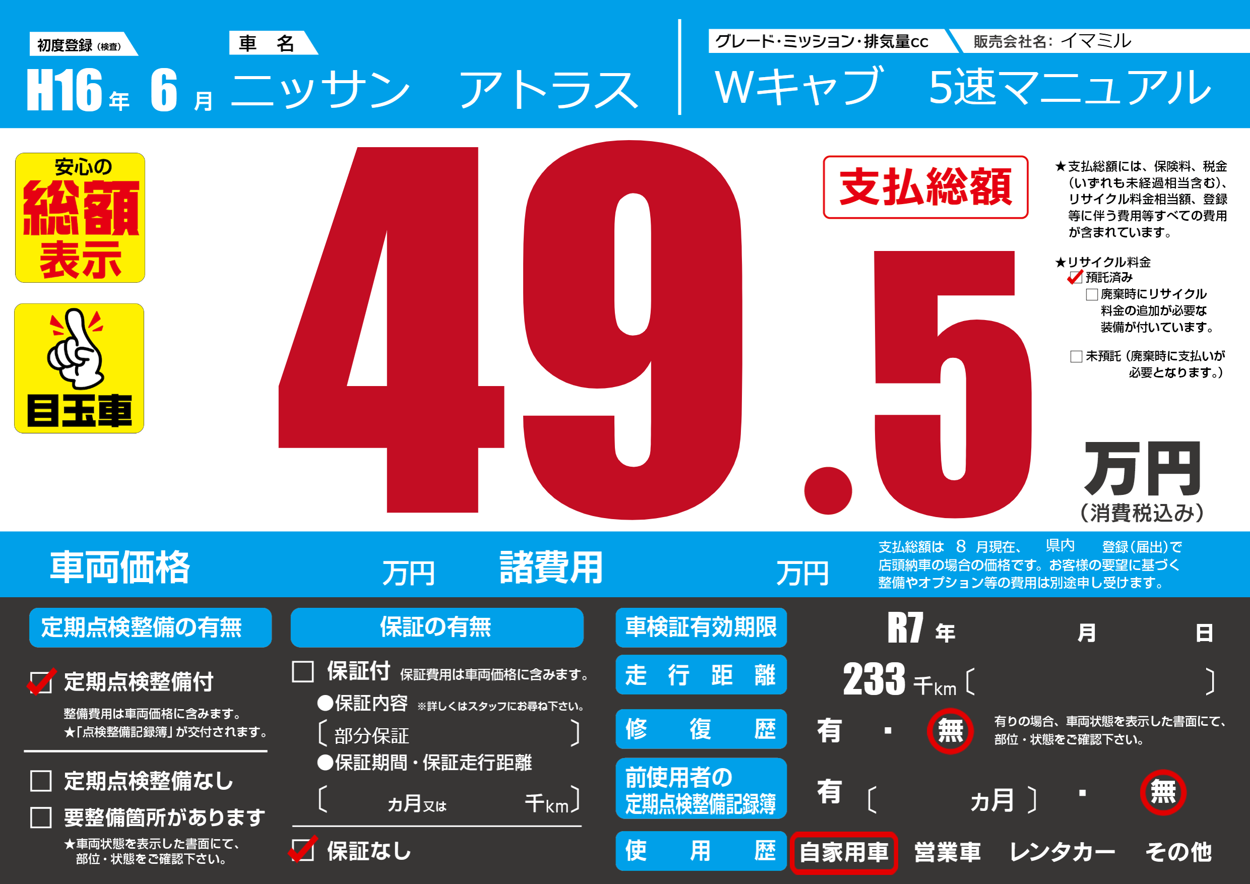 | 走行キロ | 23.3万km | 初年度登録 | H16年6月 |