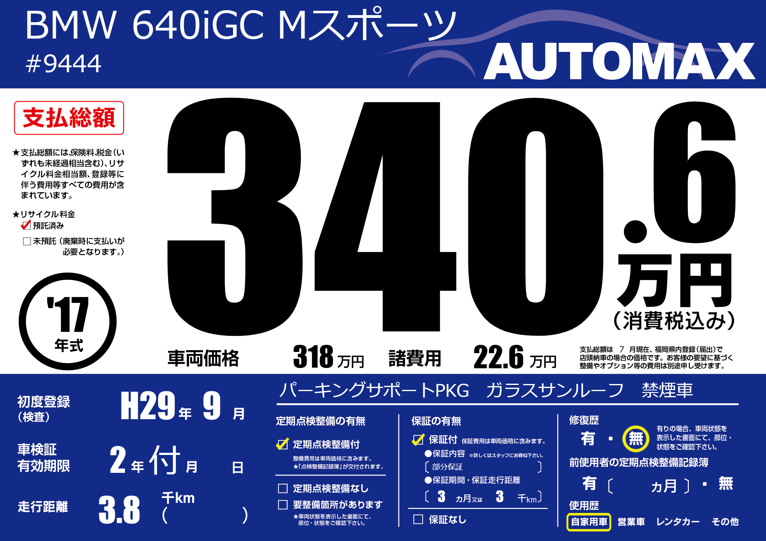 | 車名 | BMW 640iGC Mスポーツ | グレード ミッション 排気量 |