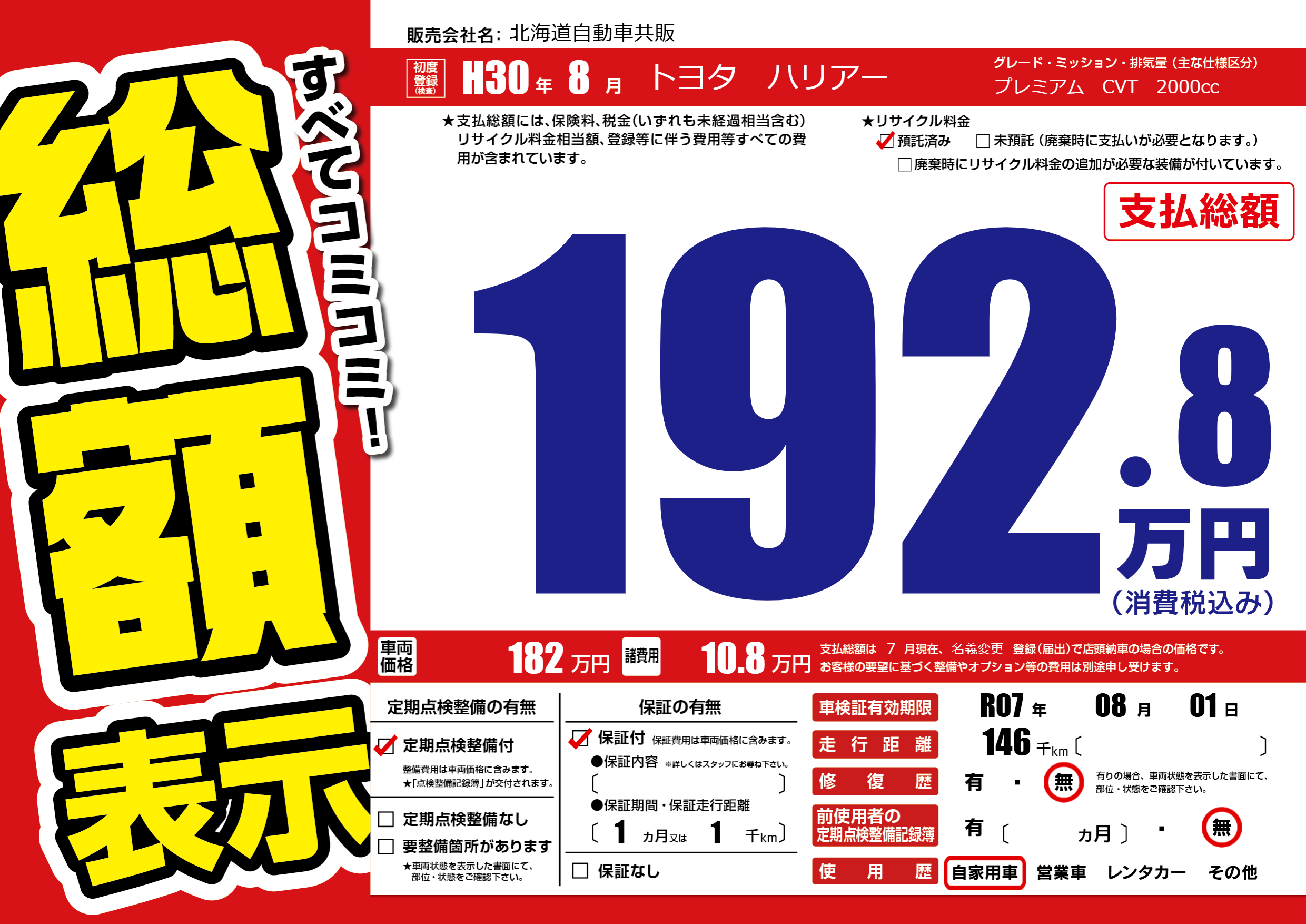 | 走行キロ | 14.6万km | 初年度登録 | H30年8月 |