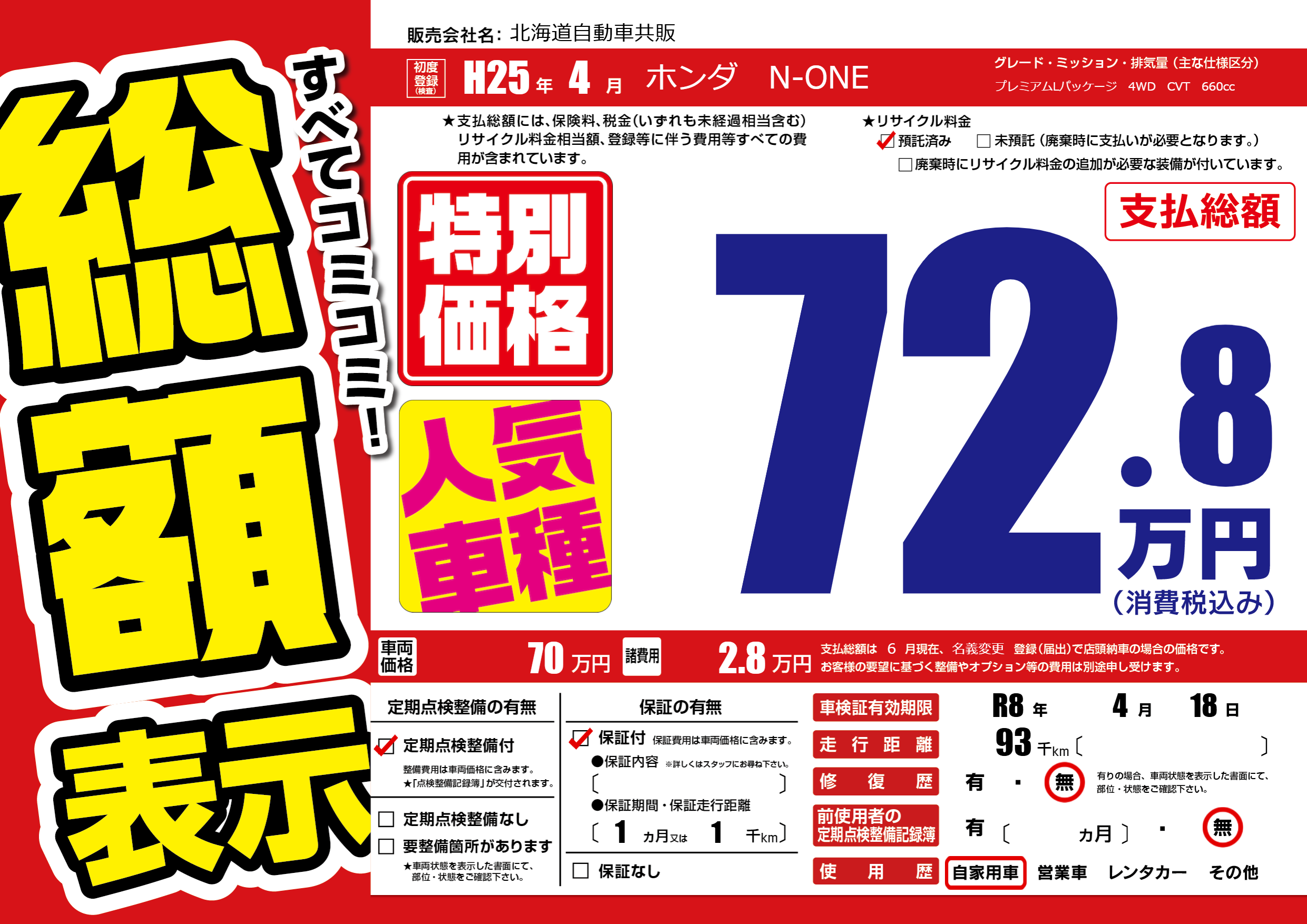 | 走行キロ | 9.3万km | 初年度登録 | H25年4月 |