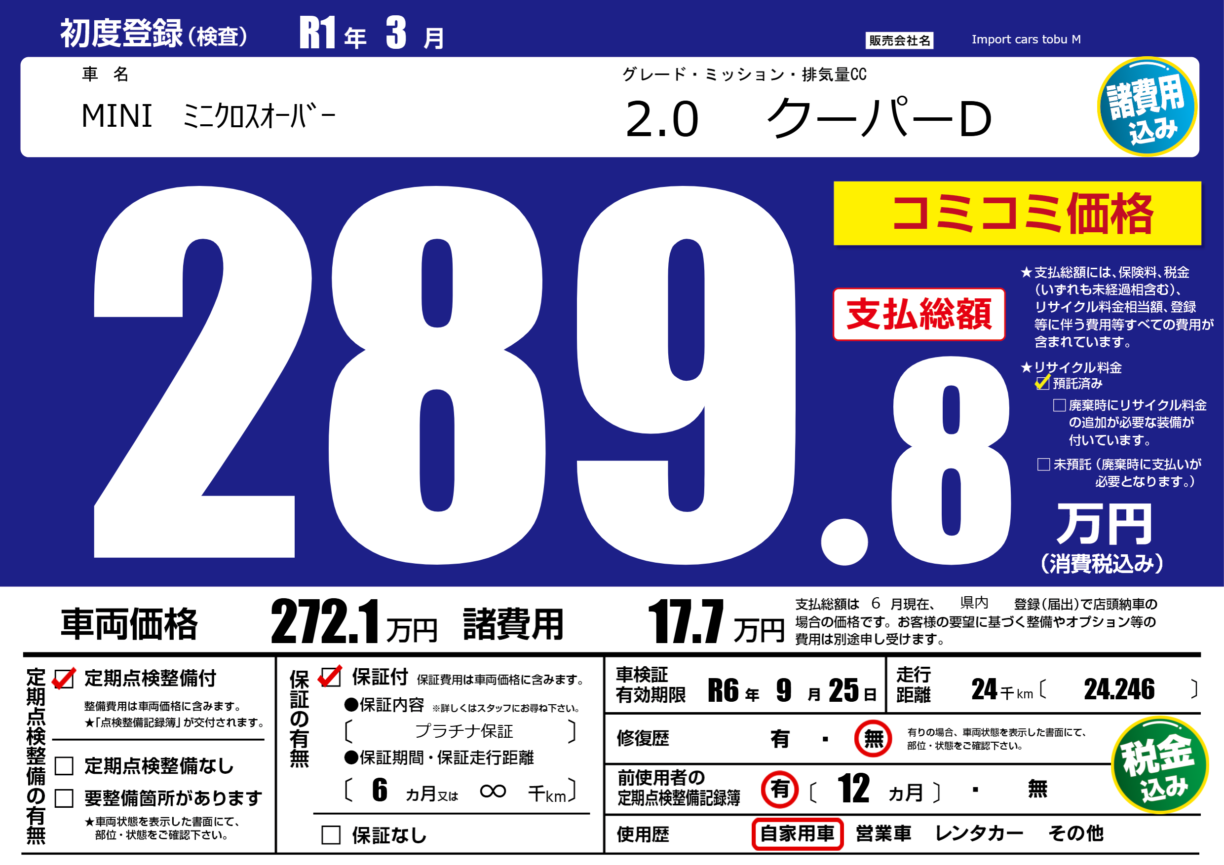 | 車名 | MINI ミニクロスオーバー | グレード ミッション 排気量 |
