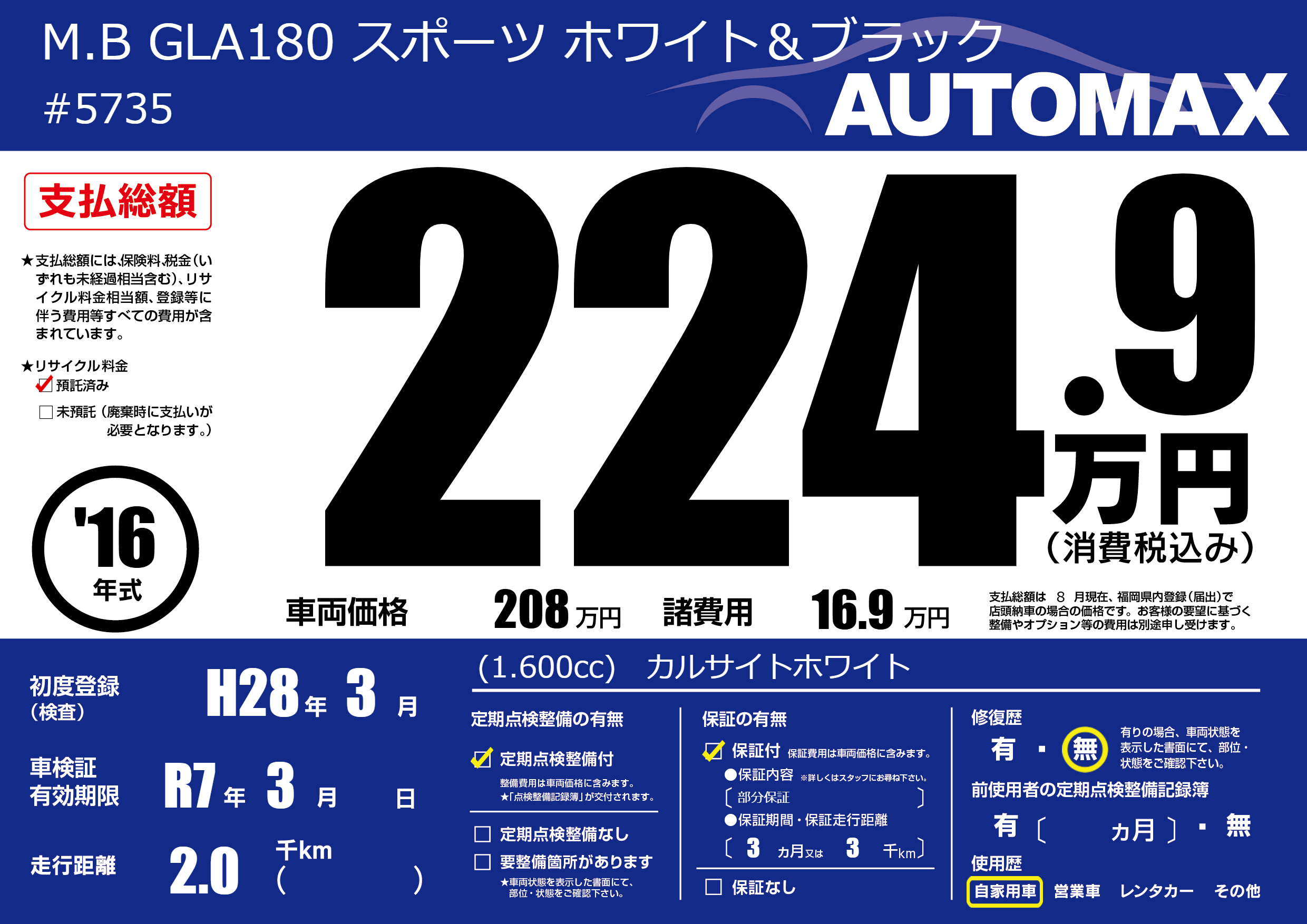 | 車名 | M.B GLA180 スポーツ ホワイト&ブラック | グレード ミッション 排気量 |