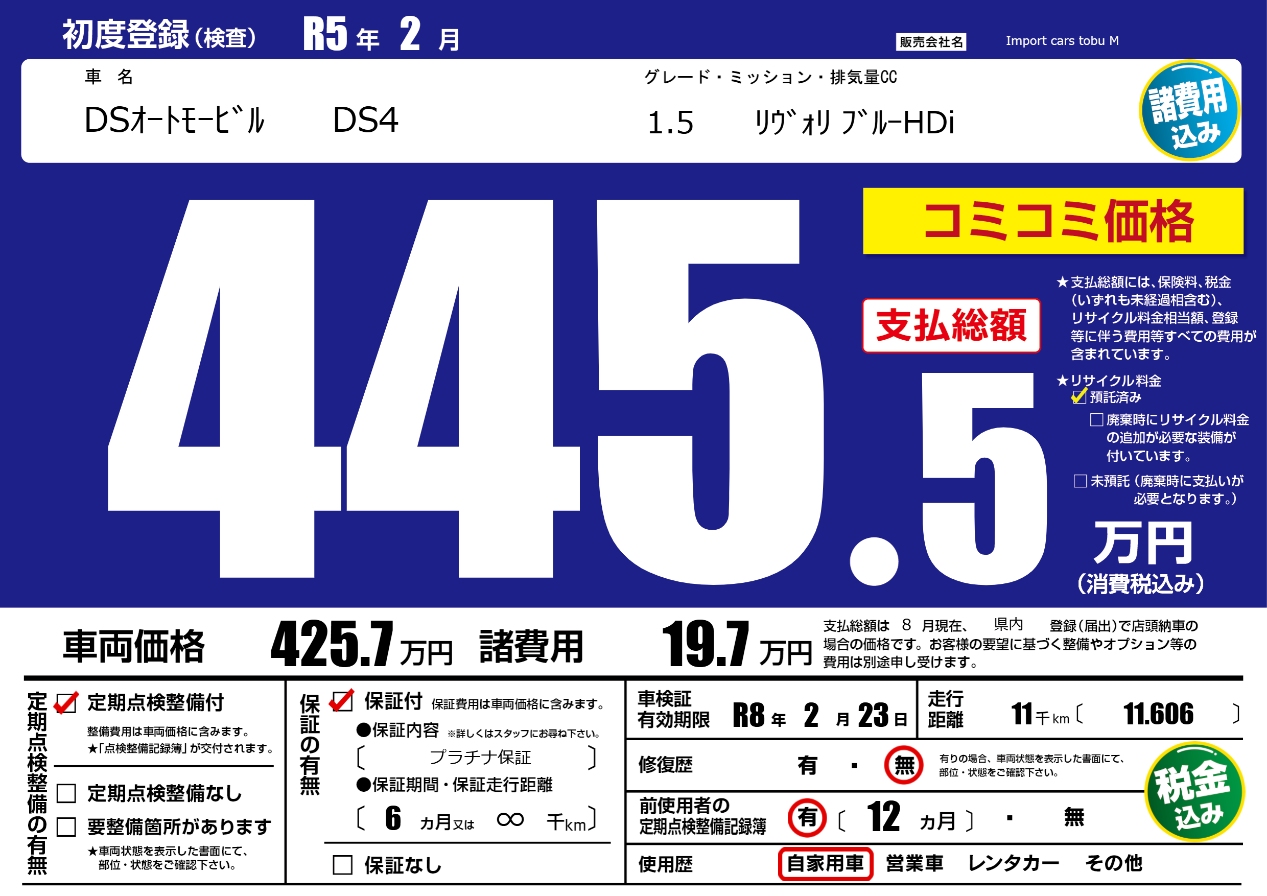保証付き 保証内容( プラチナ保証) 6ヶ月または(∞)千kmまで |