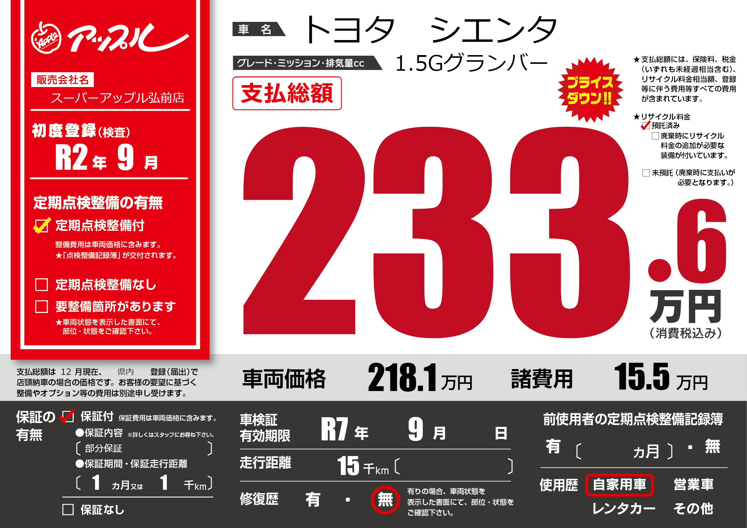 | 車名 | トヨタ シエンタ | グレード ミッション 排気量 |