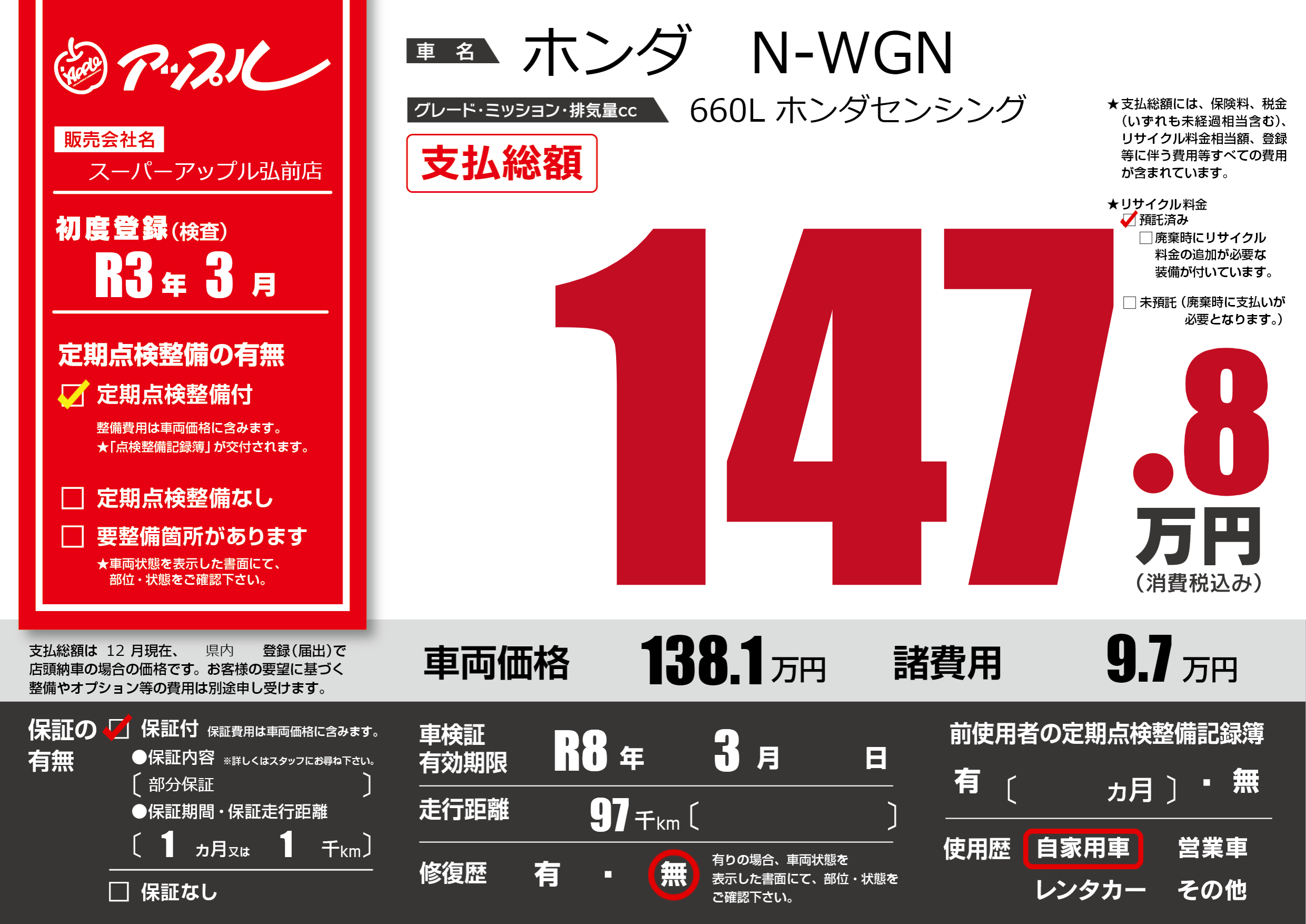 | 走行キロ | 9.7万km | 初年度登録 | R3年3月 |