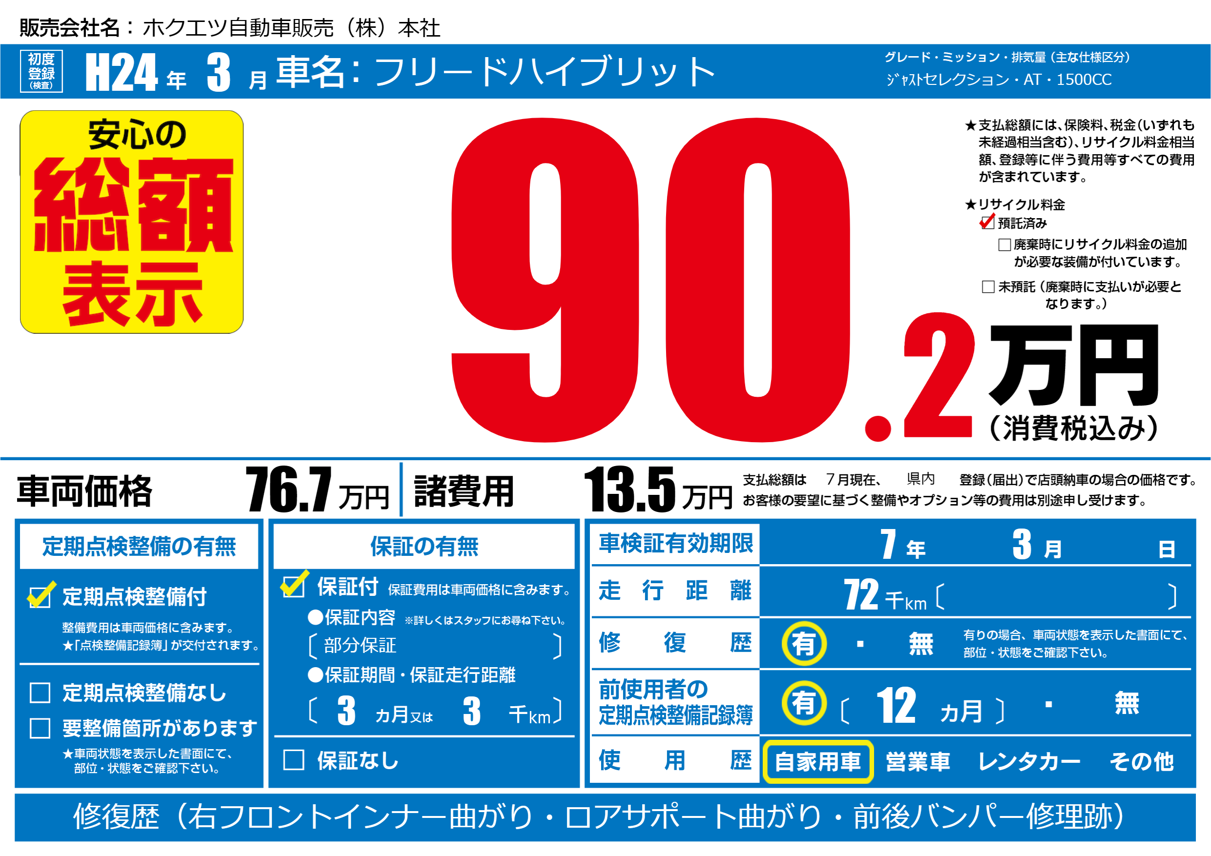 | 車名 | フリードハイブリット | グレード ミッション 排気量 |