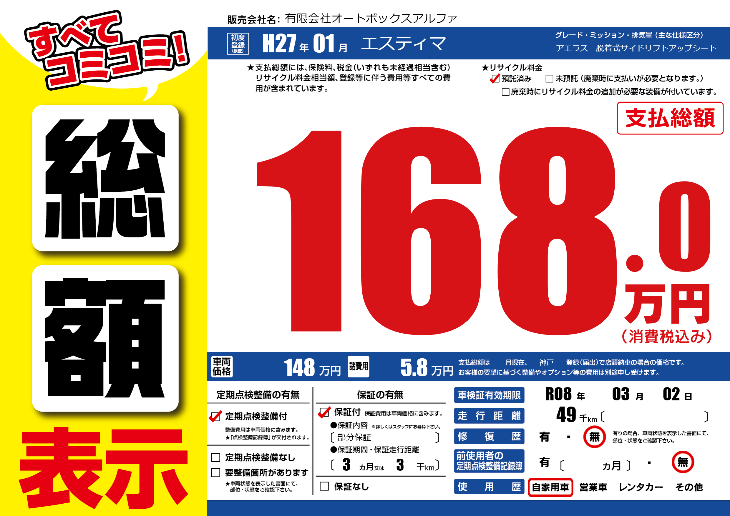 | 車名 | エスティマ | グレード ミッション 排気量 |