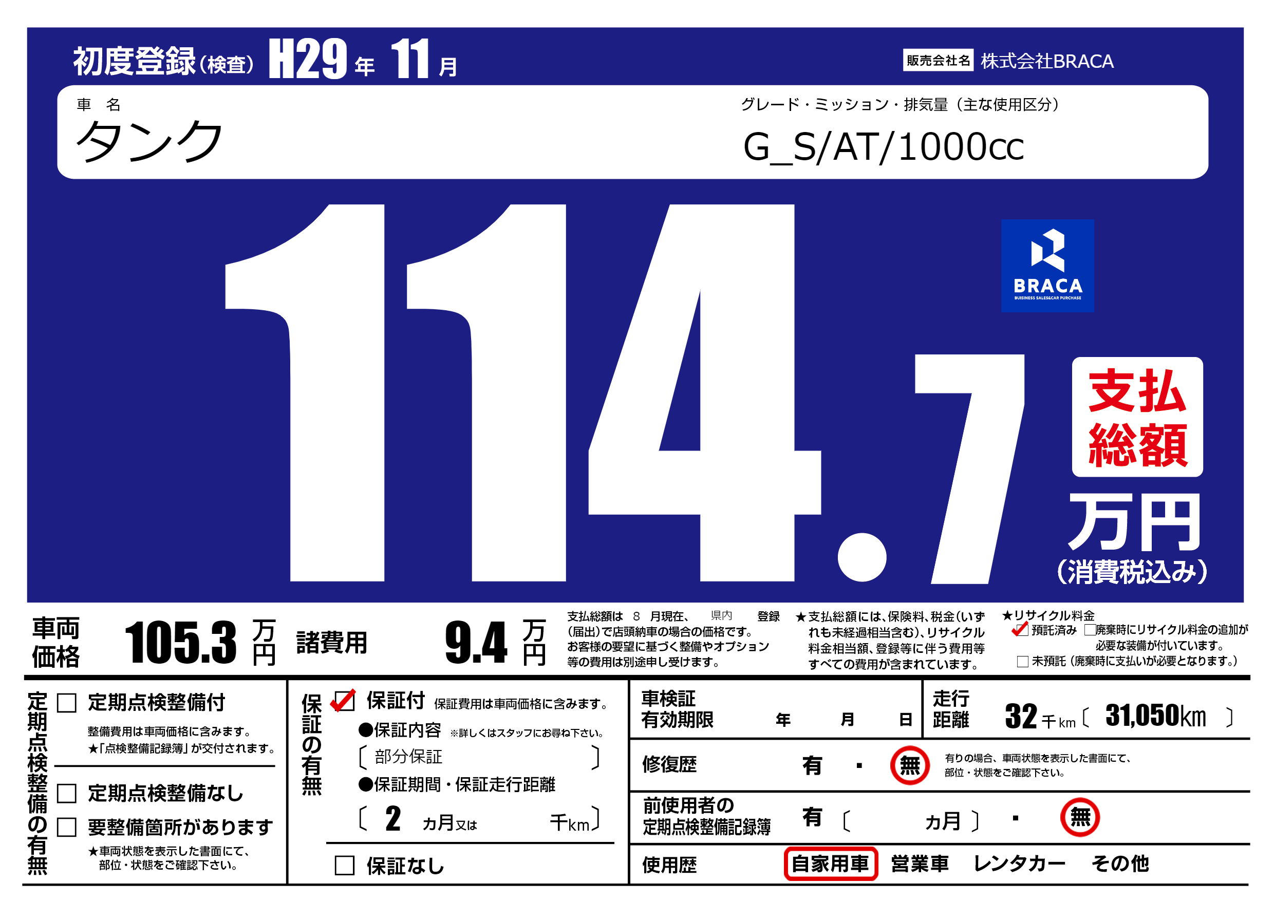 | 車検制限 | - 年 - 月 - 日 | ||